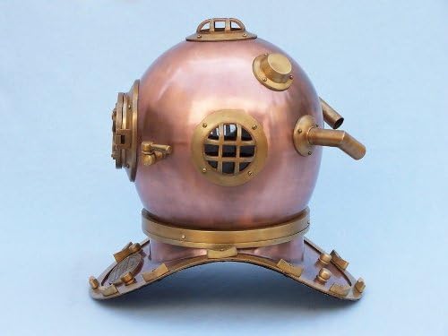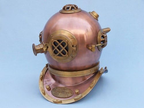 NAUTICALMART ANTIQUE COPPER DECORATIVE DIVERS HELMET 19" Dimensions: 19" L x 12" W x 18" H The Antique Copper Divers Helmet 19" is the perfect accent for any nautical themed room. This polished antique copper finish adds a glorious shine not found in all diving helmet replicas. This diver helmet replica is 19” tall. This diving helmet is a replica of the deep-sea diving helmet and is constructed of solid, highly polished, heavy-duty solid copper, and features 4 viewing holes, helmet rivets, and replica latches. Place this beautifully crafted diving helmet on a desk, table, or shelf in any home or office to add a lovely conversation piece that no nautical décor collection is complete without.