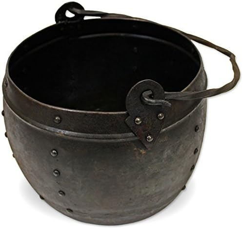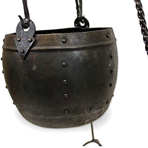 You might imagine a long-haired woman dressed in somewhat Gothic attire hovering over this steel kettle with a huge wooden spoon, stirring away the next spell formula. Or perhaps you have setup base camp before a castle raid or strategic position and keep this pot over the campfire to simmer. Whatever the cause, you need to have the right cauldron for the scenario. This handmade riveted pot will do the deed! Has a long handle with hump at the top to securely hang it from a hook and stand. Full sized medieval cooking and camping cauldron, similar to what was used by travelers, homesteaders, and even soldiers in Europe during the iron age. It is actually made of steel and iron cast and hand forged, completely made by hand with each piece having its own distinct features. Some simple welds may also be present. You could place this as a decoration piece or over a fire at the Renaissance Festival. We do NOT recommend cooking food for consumption with this pot unless you know how to properly clean (and pre-clean) steel and iron cooking surfaces. There is NO non-stick coatings to worry about scratching, and iron has a tendency to tarnish or rust when exposed to water and water-based foods. NOTE: Pictured stand is not included. For display purposes only. Specifications Overall Length: 9.25 Inches (Diameter) Overall Height: 16 Inches (w Handle) Handle Height: 8.325 Inches Pot Depth: 7.5 Inches Materials: Steel & Iron Functionality: Historical Display, Cooking Food for Eating is NOT Recommended Finish: Blackened, Rough Historical, Rustic, Handmade Includes: Cauldron with Handle Attached