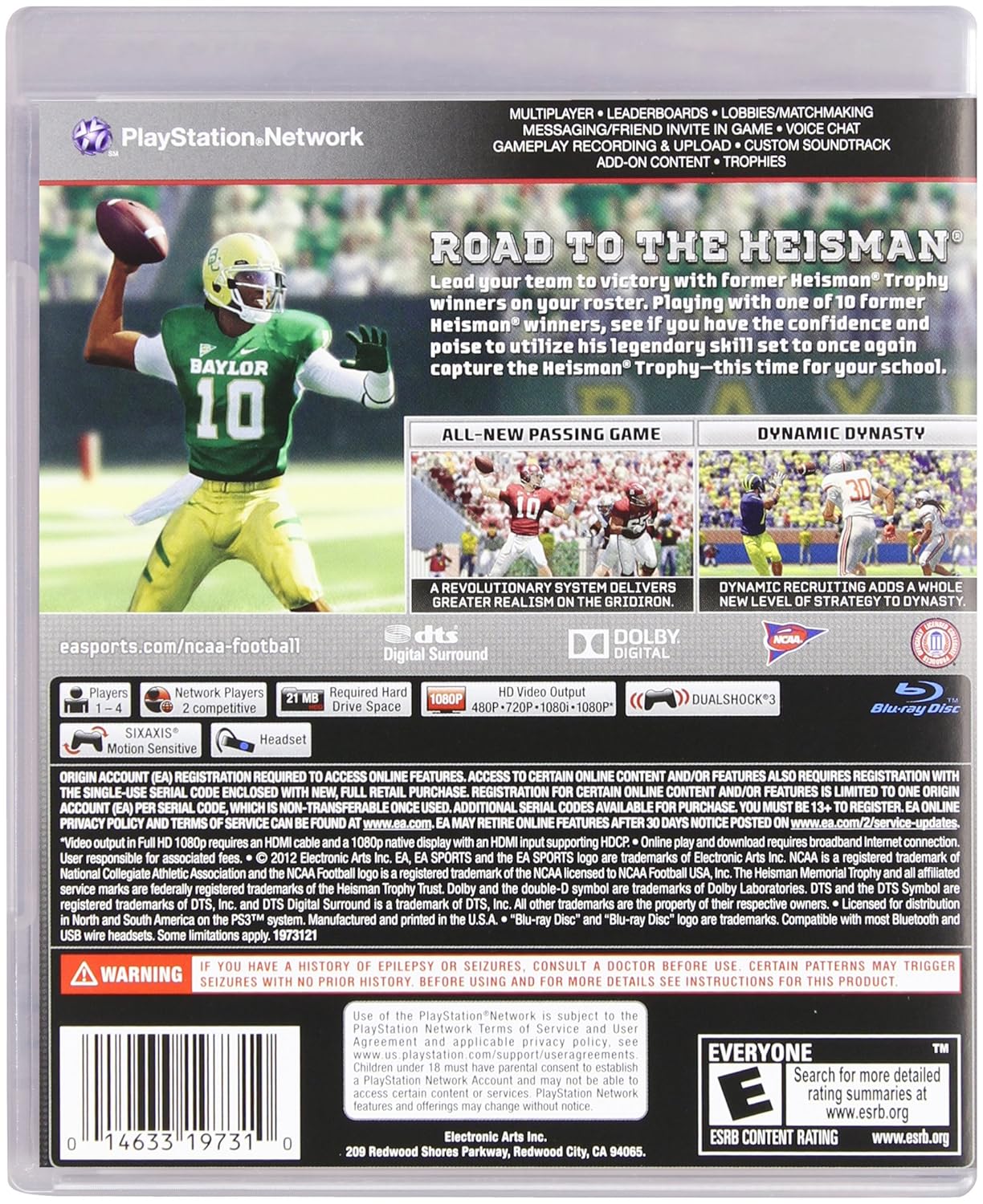 Product Description NCAA Football 13 Amazon.com NCAA Football 13 is an American college football game in which players are given the ongoing opportunity to enjoy the collegiate game in multiple ways. Experience the rise to dominance of a young, up-and-coming gridiron star hoping to make his way to a college superpower of choice and eventually a national championship. Experience the pride and pageantry of gameday Saturday like never before as you go from high school superstar, to top college player, to head coach in Road to Glory and Dynasty modes. With a new passing system, new team-specific traditions, and the Heisman Challenge, make an impact by leading your team to the National Championship with NCAA Football 13. Sights and Sounds Revel in the pageantry of college football game days with NCAA Football 13. Featuring new team run-outs, mascots and pre-game traditions along with significantly enhanced audio and new trophy presentations, NCAA Football 13 delivers the passion and excitement of college football to fans across the nation. Gameplay With a new passing system that changes the way quarterbacks and receivers play and respond, combined with a new read and react defensive AI system, NCAA Football 13 delivers greater realism on the virtual gridiron. Dynasty Game days come to life with mid-game updates featuring a new studio analyst, plus enhanced commentary from NCAA Football veterans Kirk Herbstreit and Brad Nessler. Recruiting now goes deeper than ever with the addition of dynamic grades and the ability to scout players. Plus, there are even more ways to interact with your Dynasty from the web. Heisman Challenge There are familiar faces on the field in NCAA Football 13, which now features a selection of former Heisman Trophy winners. With the new Heisman Challenge mode, fans have the ability to utilize the skill set of a legendary Heisman Trophy winner in a quest to match his award-winning historical performances and win the Heisman trophy once again. Road to Glory The experience of being a college football superstar is now even more exciting with a new feature in Road to Glory that allows players to see and feel the game differently during key moments, increasing on-field awareness and creating amazing opportunities. Multiplayer Support Prepare yourself to match your collegiate gridiron skills against friends. NCAA Football 13 supports 1 - 4 players locally, and up to 2 players in online play. Screenshots