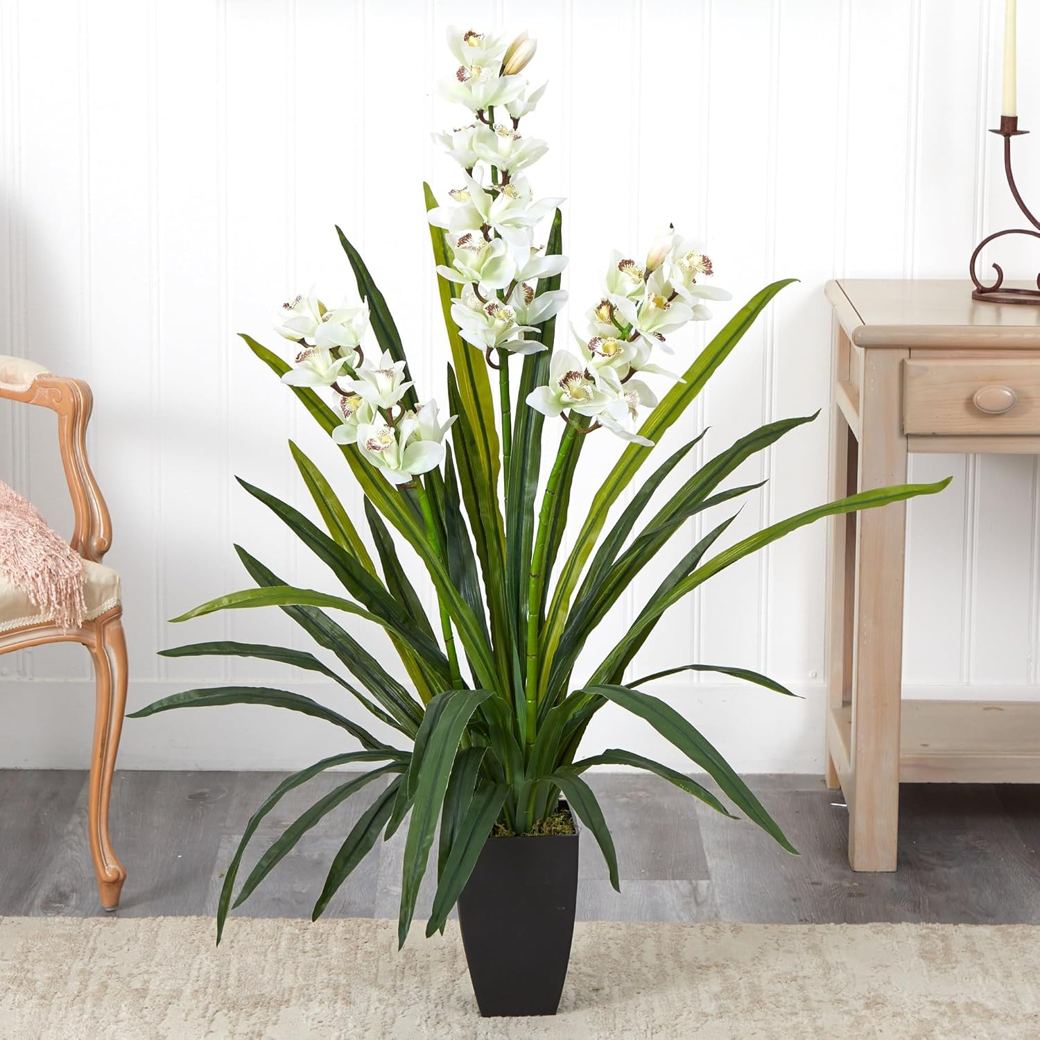 This artificial cymbidium orchid plant features an array of white blooms surrounded by lush green leaves. At 45 inches in height, it's a great addition to a well-decorated end table in your living room or hallway. Pair it with other faux flowers or glazed vases for an elegant arrangement.