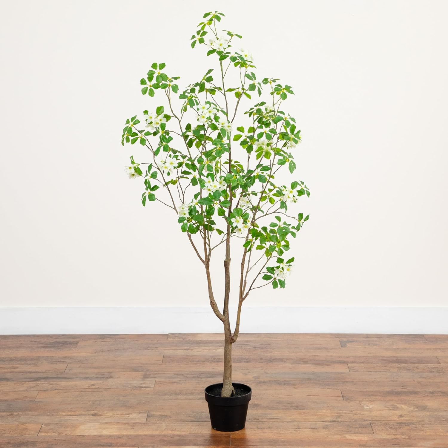 Create a serene, lush sanctuary in your home with this 5-foot artificial dogwood tree, designed for a year-round touch of nature. Expertly crafted by skilled horticulturists, this tree features distinct clusters of leaves and vibrant flowers that add a welcoming splash of color to any room. Made from premium materials, the tree's branches are flexible, allowing you to shape them for a customized, stylish look that fits your specific space. Housed in a nursery planter, it is perfectly suited for placing in your preferred decorative pot to enhance your home with its calming presence. Enjoy the beauty of a garden classic with zero watering, pruning, or sunlight required.