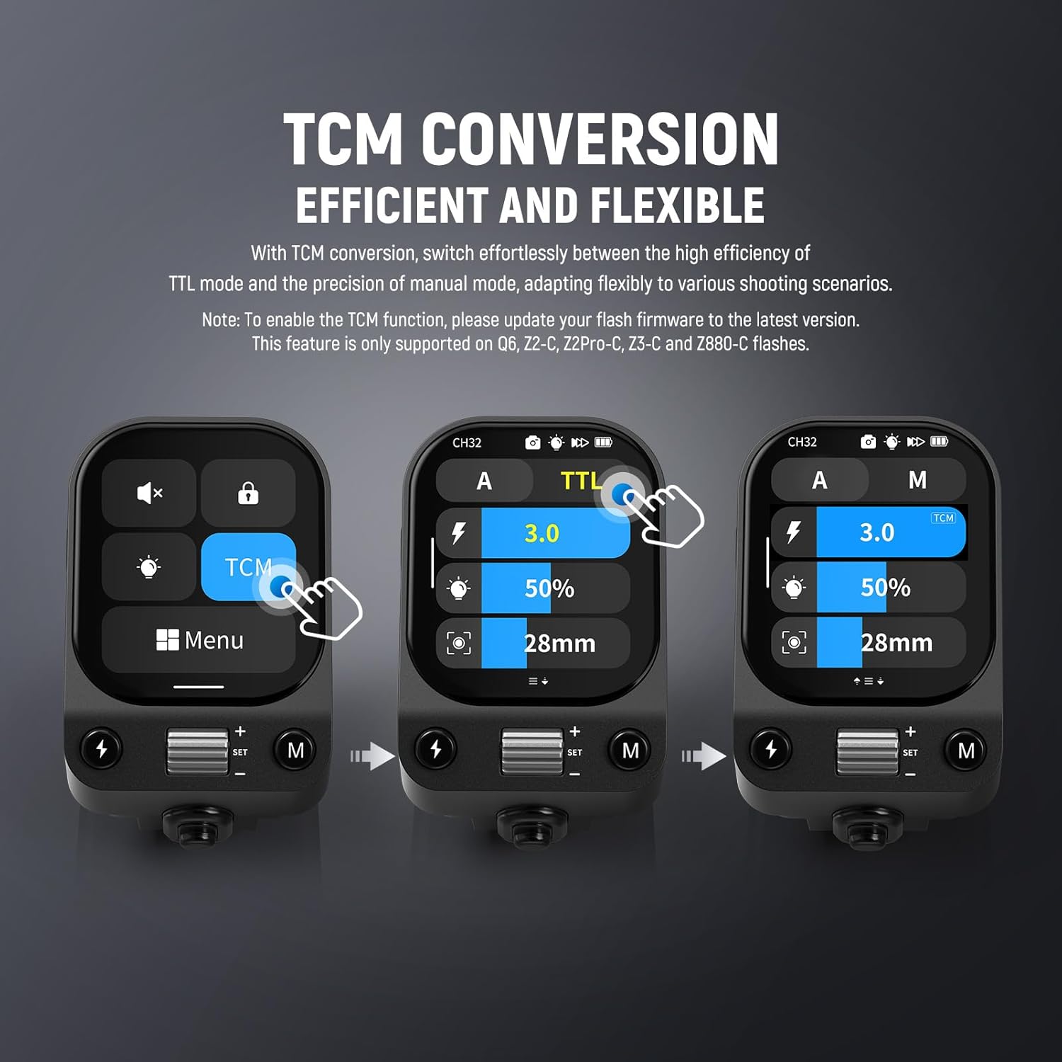 NEEWER QZ-C flash trigger features a dimmable OLED touchscreen with intuitive controls and supports high speed sync up to 1/8000s, modeling lamp, and group control. It offers versatile flash modes, including TTL, Manual, TCM, and Strobe, with exposure compensation and adjustable flash output. The 2.4G Q system enables wireless off camera triggering for various NEEWER models across 32 channels. Powered by a 1000mAh lithium battery, it charges in 2.5 hours and supports real time battery display and firmware upgrades. This trigger is compatible with Canon cameras, though not with specific models like the RP or R50. Specifications Model: QZ-C Item Type: Flash Trigger Compatibility: Compatible with Canon Cameras Built-in Battery: 3.7V, 1000mAh, 3.7Wh Charging Time: 2.5 hours TTL Auto Flash: Yes Manual Flash: Yes Strobe Flash: Yes Front Curtain Sync: Yes Rear Curtain Sync: Yes High Speed Sync: Yes Exposure Compensation: ±3EV (adjustable in 1/3EV increments) Buzzer Control: Flash buzzer can be controlled via the trigger ZOOM Setting: AUTO, Manual (20-200mm) TCM Conversion: Converts TTL to Manual output values Firmware Update: USB C port Memory Function: Yes Display Screen: Touchscreen, adjustable brightness Transmission Range: 0-100m Channels: 32 Wireless ID Groups: OFF, 01-99 Dimensions: 2.5"x1.6"x1.5"(64x41x38mm) Weight: 2.1oz/60g Package Contents 1 x QZ-C Flash Trigger 1 x USB to Type C Cable 1 x Storage Case