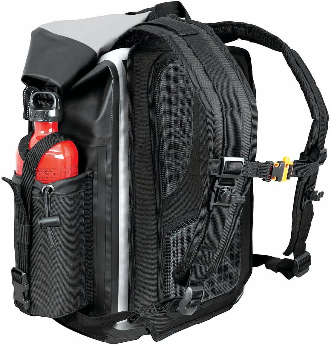 LIFETIME WARRANTY 100% waterproof backpack. All seams are electronically heat welded. Made from waterproof and durable PVC Tarpaulin. Watertight roll closure with quick release buckles. Outer material cleans easily and prevents slipping or marking. Securely mounts using patented RIGG STRAPS system. RIGG STRAPS can also be used as a separate tie down system. Padded back panel is sectionalized to allow for better air flow. Back panel pad opens to conceals backpack straps when using as a tail pack. Dual quick release closure either over the top or down the sides. Purge valve makes for easy compression. Inner loops for attaching smaller items for quick access. Front MOLLE panel includes a clear waterproof document pocket. Integrated external pocket to hold optional hydration bladder (CL-HYDRO-S not included). Side bottle pocket large enough to hold 30 oz. fuel bottles (Bottles not included). Side MOLLE panel to add other optional accessories. Backpack straps are adjustable and padded for comfort. Dimensions: 12.5”L x 7”W x 21.5”H Hold approx. 30 liters