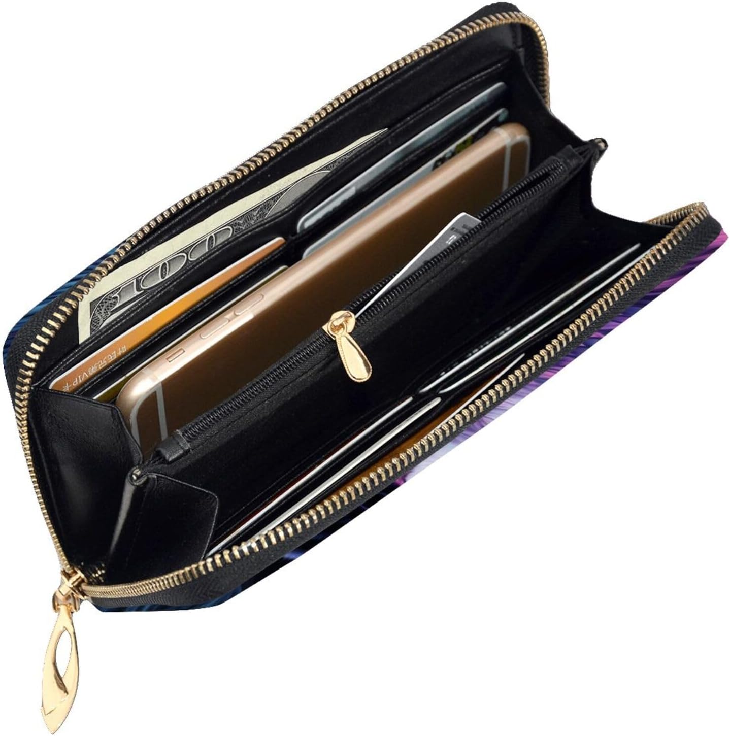 Neon wolf with purple head This women's double-sided printed wallet is stylish, practical, and durable, helping you easily upgrade your daily life and meeting all your storage needs. The unique double-sided printed design showcases your personality and fashion sense, making it not just a wallet, but also a versatile fashion accessory that perfectly complements your everyday outfits. The scientifically designed internal structure maximizes storage space while maintaining a slim profile. With 12 credit card slots, 3 full-length cash pockets, 1 built-in zippered coin pocket, 1 hidden compartment, 1 document slot, 1 passbook slot, and 1 checkbook compartment, you can easily store all your daily essentials: credit cards, cash, coins, receipts, checkbook, ID, and even your mobile phone, keeping everything organized and within easy reach. Suitable for daily commutes, shopping, travel, work, and various other occasions.