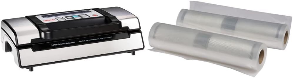 Nesco Deluxe Food VS-12 Vacuum Sealer, 130 Watts, Kit Bags & Viewing Lid, Compact, SilverThe NESCO VS-12 Deluxe Vacuum Sealer offers all the versatility and performance you could ever need from a vacuum sealer. Choose from three seal settings: Dry, Moist, and Double; then choose your vacuum pressure ”Normal or Gentle” to keep softer foods safe. The built-in bag cutter and roll storage compartment with clear viewing window make this an all-in-one stop for keeping food fresh up to 5 times longer than traditional methods. This sealer can accommodate up to an 11.8" width bag providing the versatility needed for a wide range of sealing jobs. Two rolls are included to get you started, one 8.6" x 9.85" roll and one 11.8"x 9.85" roll. The NESCO Deluxe Vacuum Sealer is compatible with any brand of vacuum sealer bags.NESCO VS-04R Two 11" x 20' Vacuum Sealer Rolls for Custom-sized Vacuum Sealer Bags Compatible with Nesco vacuum sealers and other brandsThe Nesco VS-04R Replacement Roll Bags, 2-Pack, can be sized according to your needs and are BPA-free and safe to microwave, boil and freeze. You can even put them in the dishwasher and re-use. Traditional storage methods can allow food containments to seep in. Oxygen-fed mold and bacteria can cause food spoilage, moisture leads to freezer burn and penetrating odors compromise flavors. Vacuum sealing extracts the air and provides a moisture barrier so your food will stay fresh and last longer. Our patented bagging material is specially designed to lock in freshness and flavor by keeping air, moisture and odors out. The multi-layer construction is tear-resistant and features cross-venting channels on both sides to allow for maximum air extraction. Dimensions: 11.0" X 19.69'.NESCO Vacuum Sealer Bags 8" x 20", Use for Sous Vide or Meal Prep, BPA Free, Dishwasher Safe, Tear Resistant, Safe to Microwave, Boil, or FreezeThe NESCO VS-03R Replacement Roll Bags, 2-Pack, can be sized according to your needs and are BPA-free and safe to microwave, boil and freeze. You can even put them in the dishwasher and re-use. Traditional storage methods can allow food containments to seep in. Oxygen-fed mold and bacteria can cause food spoilage, moisture leads to freezer burn and penetrating odors compromise flavors. Vacuum sealing extracts the air and provides a moisture barrier so your food will stay fresh and last longer. Our patented bagging material is specially designed to lock in freshness and flavor by keeping air, moisture and odors out. The multi-layer construction is tear-resistant and features cross-venting channels on both sides to allow for maximum air extraction. Dimensions: 7.87" X 19.69'.
