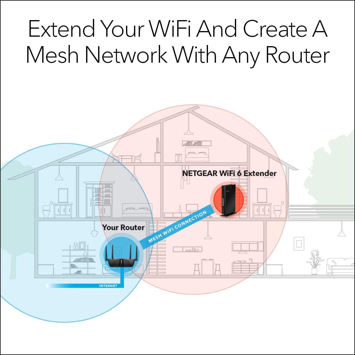 The NETGEAR 4-Stream WiFi 6 Mesh Extender (EAX18) creates a powerful mesh WiFi network for increased coverage in your home. The latest generation WiFi 6 (802.11ax) offers dramatically faster WiFi. It’s backwards compatible with current and previous generation routers and devices (WiFi 5 and earlier generation WiFi standards).
