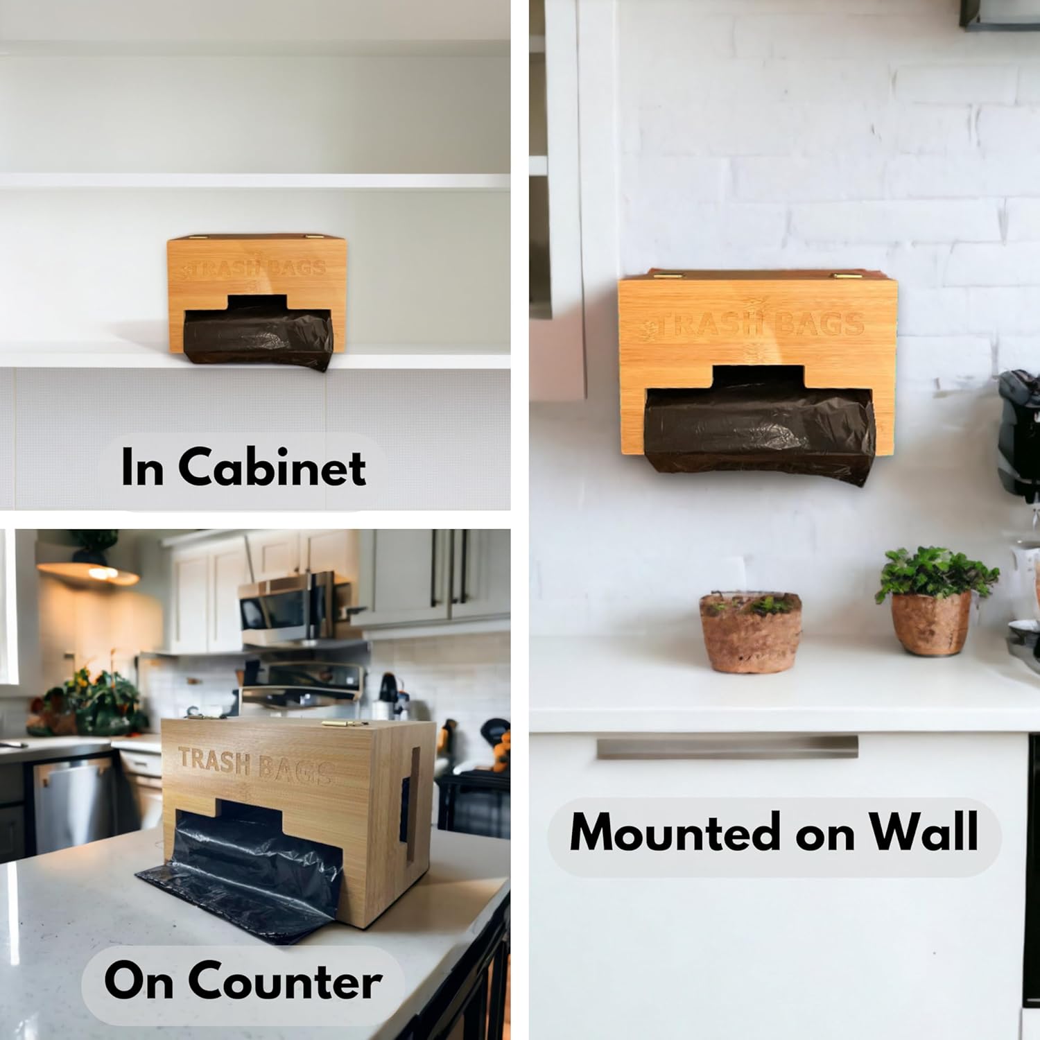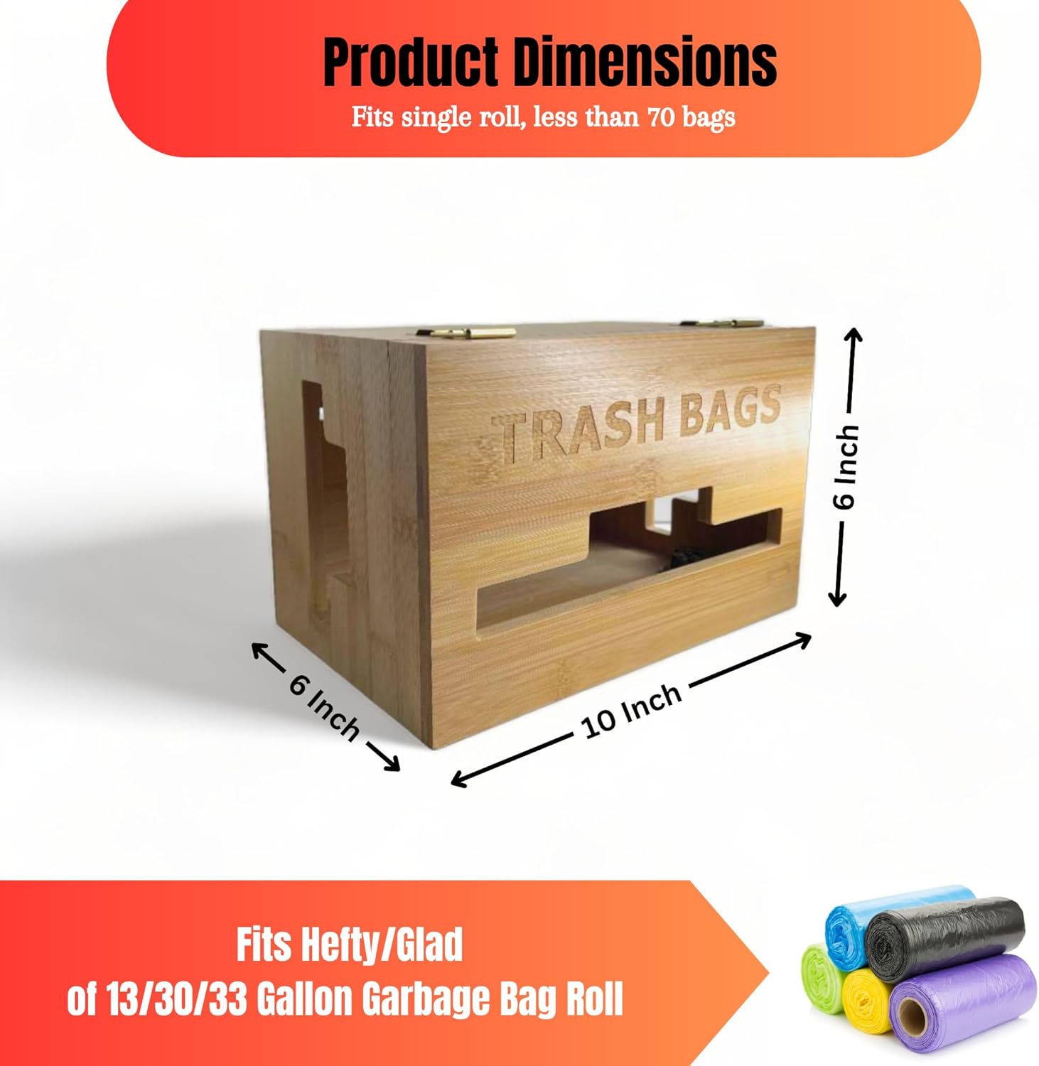 Say goodbye to the chaos in your kitchen! If your kitchen cabinet or under-sink space has become a daily battle, and those garbage bag rolls seem to have a mind of their own, we have the perfect solution. Our Bamboo Plastic Bag Holder is here to transform your kitchen organization and make your life easier, one bag at a time. Why choose our bamboo grocery bag organizer? - Our garbage bag organizer features a double roller catch for a secure closure, ease of access, and ensuring durability with long-lasting performance. You can open and close the kitchen storage organizer with a simple push or pull, making it convenient for quick access and preventing plastic bags from falling out at the same time. - You can simply place the trash bag organizer dispenser on your countertop, in cabinet, under sink, or mount it on wall using the four "+" type holes on the back of storage, allowing for both horizontal and vertical installation options with 4 screws and 4 anchors (Included in your package) to create an organized kitchen that suites your needs. - With two handy side-handles, our designs ensures effortless access to your plastic rolls while making it easy to grab or lift the plastic bag organizer, enhancing both convenience and portability. - Its innovative design accommodates your 13/30/33 gallon trash bag and plastic grocery bag rolls from Hefty or Glad. And the best part? Our trash bag storage dispenser provides a space for less than 70 rolls. Efficiency and style in one package. - Enhance the visual appeal of your kitchen with our wooden garbage bag holder, featuring laser engraving that reads "TRASH BAGS". Tip: Measure your garbage bag rolls before purchasing Newtures grocery bag holder for plastic bags. Its lightweight, 1.7 Ibs and compact size, 10"x6"x6", accommodates less than 70 rolls of 13/30/33 gallon.