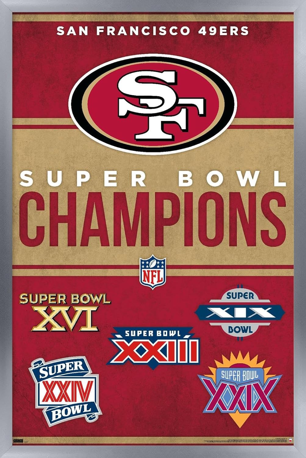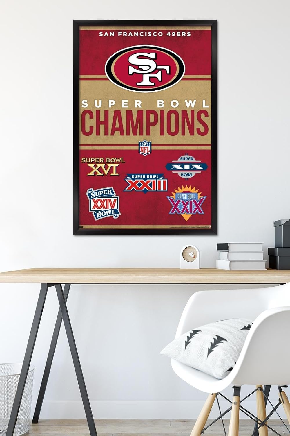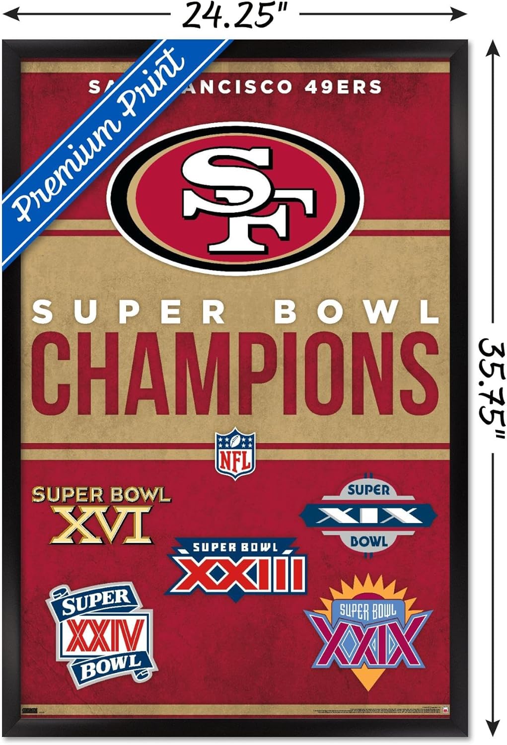 Trends International framed posters are everyone's favorite room decor! The clean, modern design and premium satin finish of this NFL San Francisco 49ers - Champions 23 Wall Poster will make a bold wall decor statement in any room. Decorate the bedroom, bathroom, kid's room, living room, office, dorm, and more! Our framed posters are lightweight and easy to hang using the sawtooth hanger so you'll be able to enjoy it in no time. Every one of our framed posters are proudly Made in the USA. Add these decorations alongside the other accessories on your party supplies list too! Trends International's wall posters are the perfect way to dress up your parties. A framed poster makes a great gift as well! Whether it's for a birthday, Christmas, house warming or for your best friend, they'll love receiving a framed poster to show off their style.