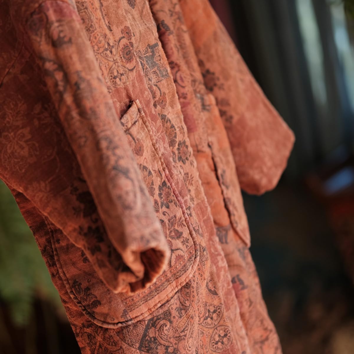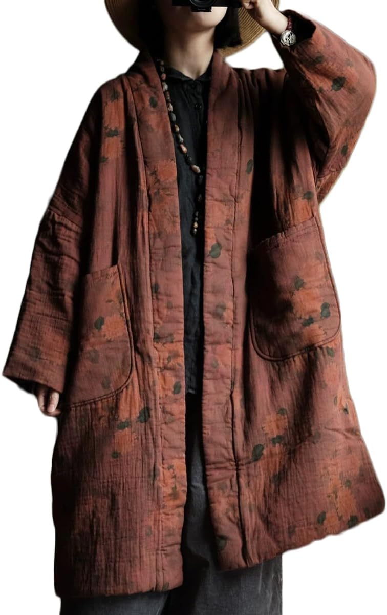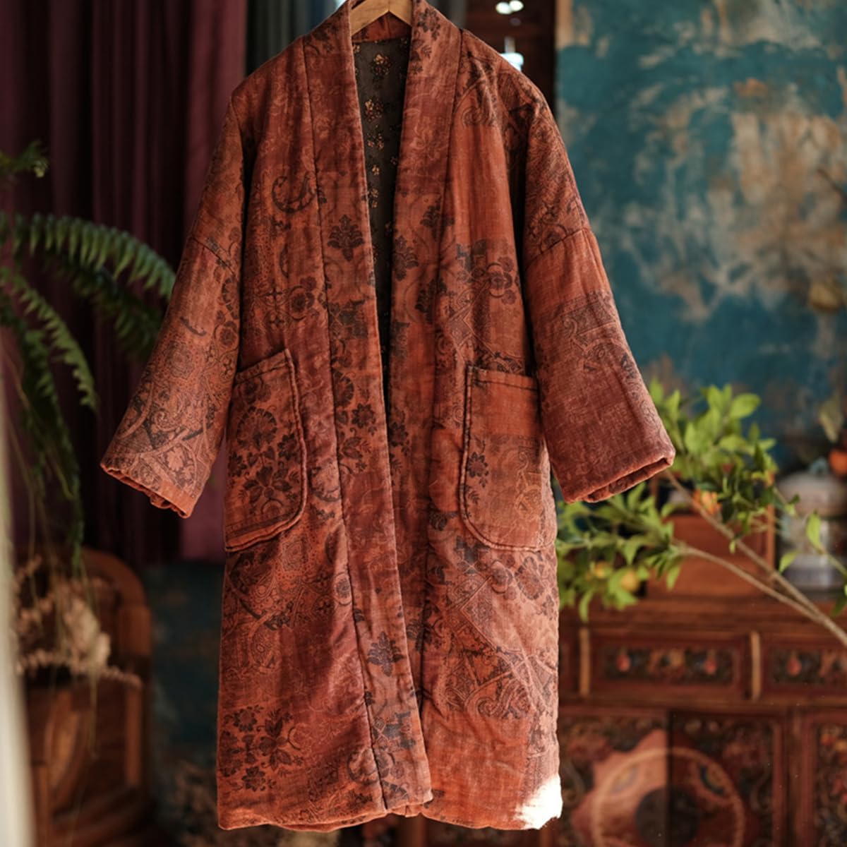 This elegant women's quilted jacket brings together traditional craftsmanship and contemporary style in one stunning piece. Featuring a beautiful printed pattern in rich earthy tones, this open front kimono-style coat offers a relaxed, loose fit that drapes gracefully for effortless sophistication. The long sleeves and knee-length design provide excellent coverage while maintaining a flattering silhouette. Practical details include convenient side pockets perfect for keeping your essentials close at hand. The quilted construction adds texture and visual interest while providing comfortable warmth for cooler days. This versatile coat layers beautifully over both casual and dressy outfits, making it ideal for everything from weekend errands to evening gatherings. The open front design allows for easy styling and creates an elongating effect that complements various body types. Whether paired with jeans for a relaxed look or worn over a dress for added elegance, this distinctive jacket is sure to become a wardrobe favorite. The unique printed pattern ensures you'll stand out while the classic kimono-inspired silhouette keeps your look timeless and refined.