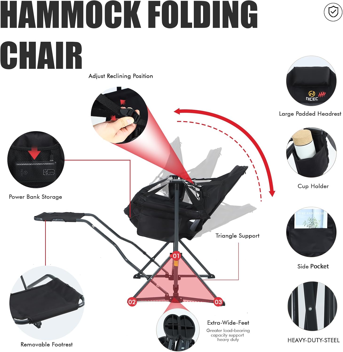 Nice C Hammock Camping Chair with Canopy, Portable Hammock Chair with Shade, Folding Swinging Chairs, Rocking Camping Chairs, with Adjustable Canopy, Cup Holder (1 Pack, w/Canopy) + Nice C Heated Hammock Camping Chair with Footrest, Heated Camping Chair with Battery, Rocking Swing Chairs, Hammock Chairs with Stand, Heavy Duty (1, Heat Black W/Footrest)