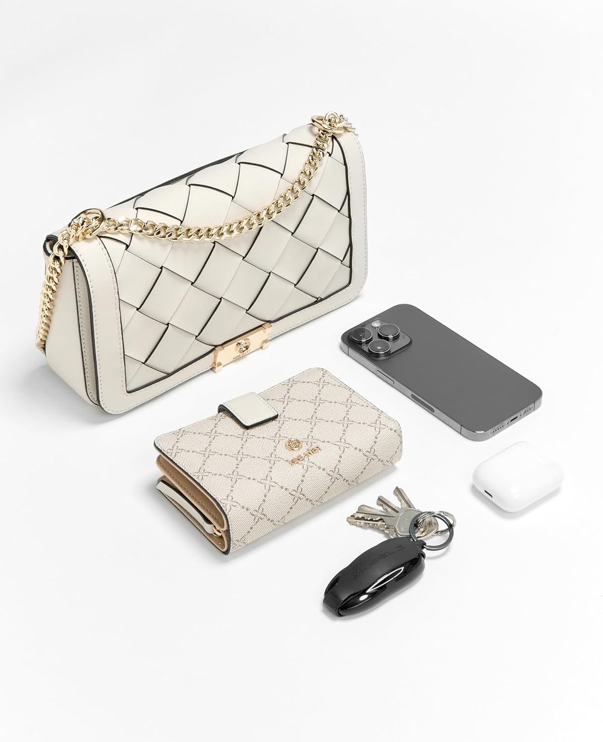 Nine West designer Mylah flap convertible chain crossbody, great silhouette with woven and hardware details. Perfect for everyday, night out or event, beautiful durable material and gold hardware. Convert from shoulder to crossbody