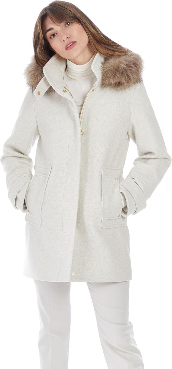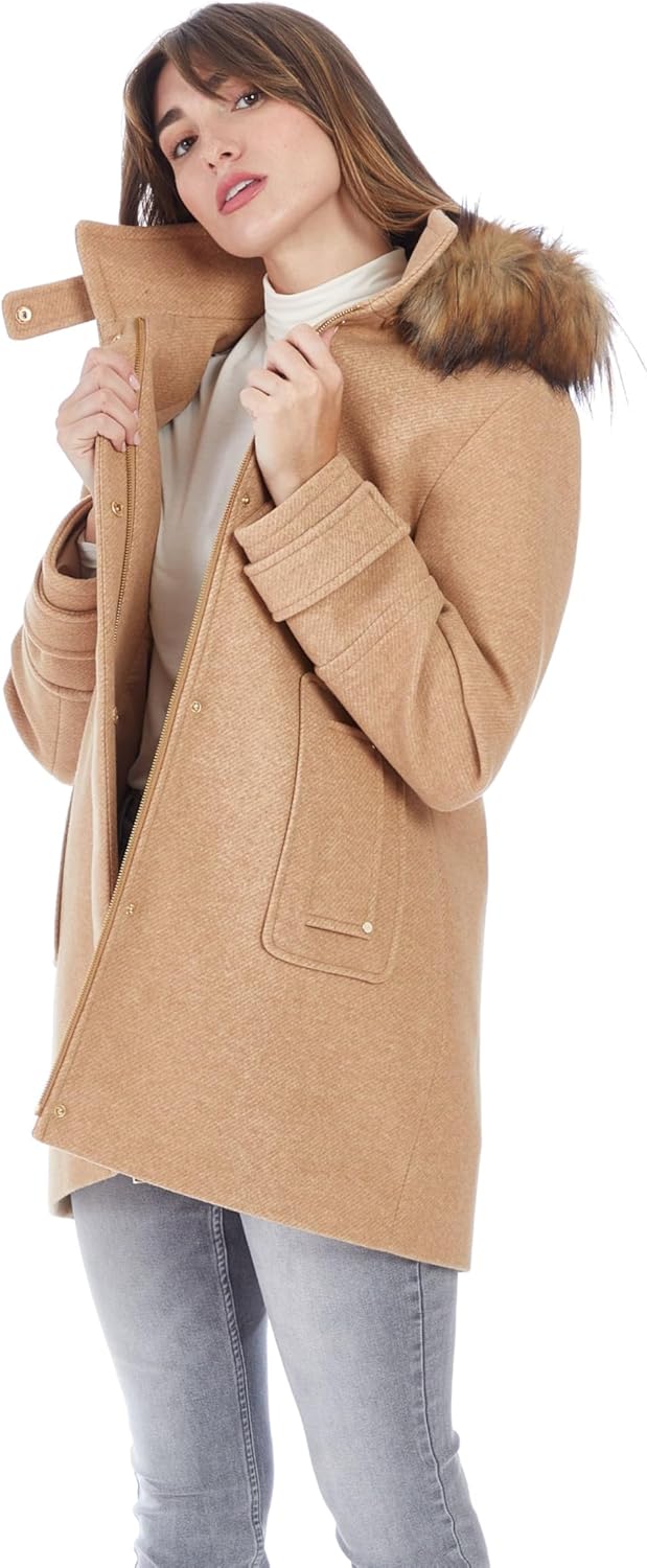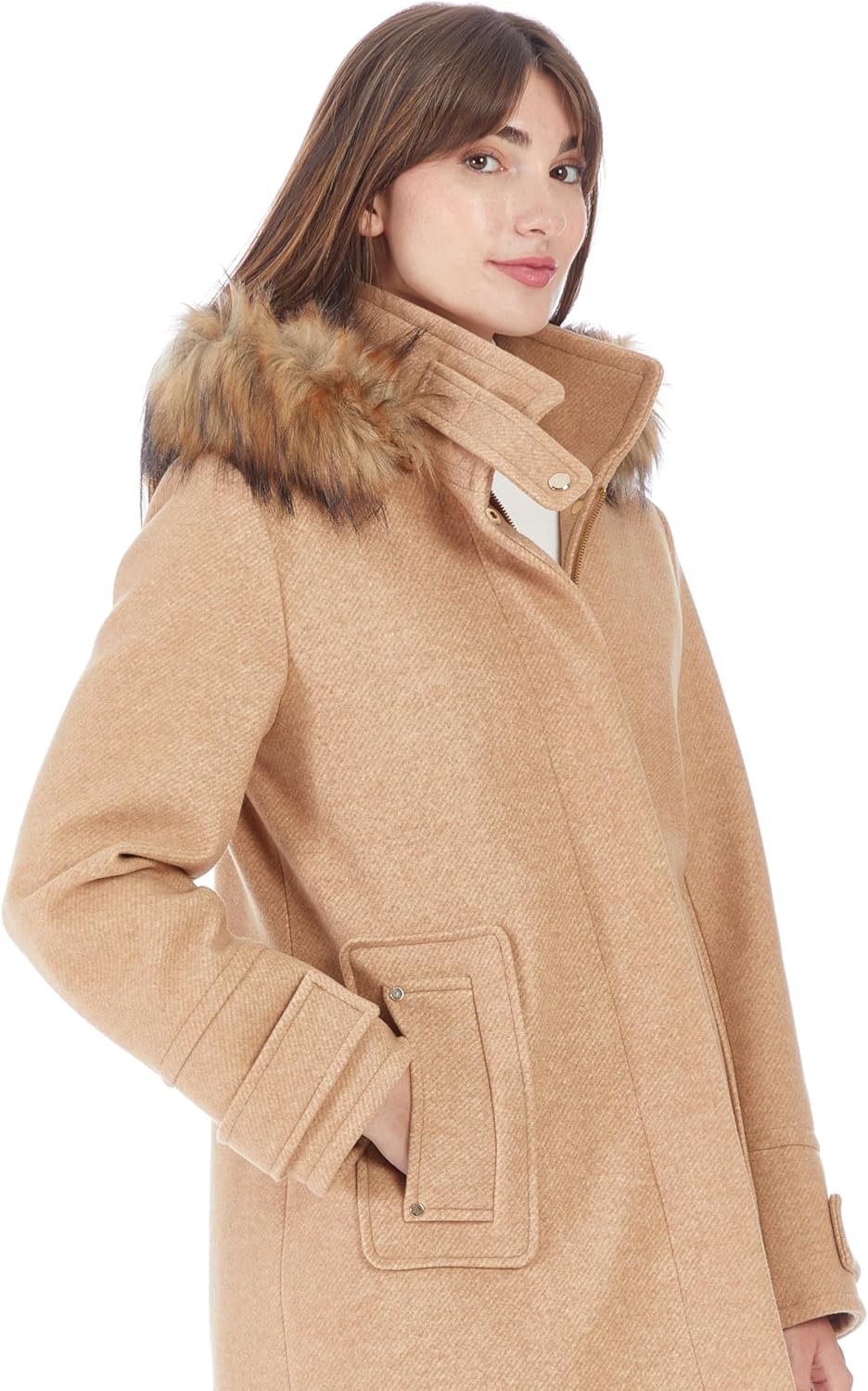Stay warm and stylish in this Nine West faux wool coat, designed with a detachable faux fur–trimmed hood, zip-front closure with snap placket, and functional flap pockets. Available in Camel, this mid-length coat blends timeless elegance with everyday versatility.