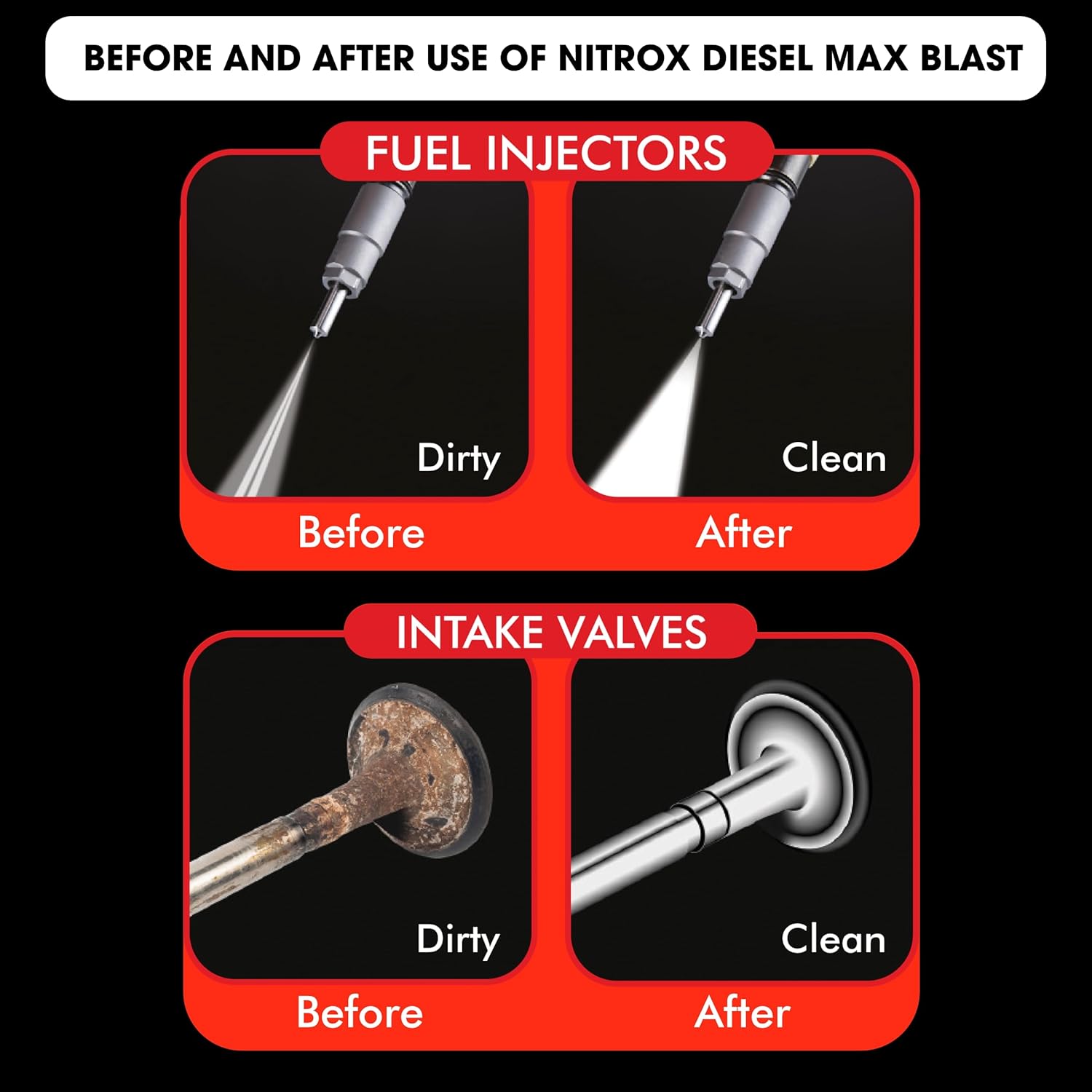 Get the Power with Nitrox Diesel Max Blast –This multi-purpose formula contains technically advanced additives specially designed to clean, protect, and give your entire fuel system and combustion chamber the detox it needs. Once added to the fuel tank the detoxification process begins cleaning and restoring key engine parts, such as injector valves, pistons, intake manifolds, cylinder heads and combustion chambers.The powerful formulation will bring your entire fuel system back to life and help to restore lost power and acceleration in one quick max blast.Suitable for high mileage vehiclesProvides an entire fuel system detoxRestores lost power and acceleration almost immediately