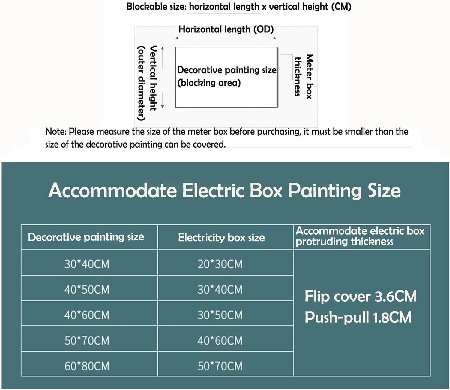 HSOQNName: Electricity Meter Box Decorative Painting Style: Flip top opening to the left Frame: PS material Border: Classic black Painting Core: Crystal film Technology: Digital printingDimensions: Width x Height Product Size: 30x40cm(11.81x15.75in),40x50cm(15.75x19.69in),40x60cm(15.75x23.62in),50x60cm(19.69x23.62in),50x70cm(19.69x27.56in),60x80cm(23.62x31.5in)Coverage Size: 20x30cm(7.87x11.81in),30x40cm(11.81x15.75in),30x50cm(11.81x19.69in),40x50cm(15.75x19.69in),40x60cm(15.75x23.62in),50x70cm(19.69x27.56in) About Packaging: 1x Electrical Panel Decorative Artwork + corresponding accessories Tip: Please measure your electrical panel specifications before purchasing; the dimensions should not exceed the area covered by the decorative artwork.