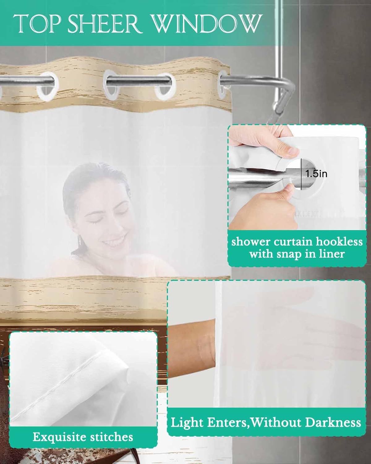 Create Unique Space in BathroomTransform your bathroom into a functional space with no hook double layer shower curtain with exquisite print. Whether you're a busy parent, a renter, or student in accommodation, farmhouse bathroom shower curtain solves privacy problem while elevating space's aestheticsPremium Polyester FabricMade from quick-dry, waterproof, soft and breathable polyester fabric, shower curtain double layer liner allows water droplets to condense and slide off quickly while maintaining a sleek, wrinkleFree appearance. Give you a security and comfortable bathing experienceNo-Hook Split Ring DesignThe reinforced plastic split ring on buthtubs curtains makes installation easier without any tools or hooks. It's really convenient for girls with little strength or busy families. Just hang split rings on the shower rod and slide smoothly, the assembly is completedSheer Viewing WindowThe through mesh top on removable shower curtain set allows for air circulation, accelerating evaporation to dry quickly. Sheer viewing window is private and breathable while taking a bathNice Gift OptionDon't worry anymore about choosing a practical and beautiful gifts Shower curtain for hotel with exquisite prints is perfect as a gift for Christmas, Easter, Thanksgiving, Halloween, New Year, Father's Day, Mother's Day, Valentine's Day, St. Patrick's Day, birthdays, weddings, and housewarmingMultiple SizesWe offer the following no hook shower curtain with snap in liner sizes36"x72" Inches36"x78" Inches48"x72" Inches54"x78" Inches60"x72" Inches66"x72" Inches72"x72" Inches72"x78" Inches72"x84" Inches72"x96" InchesCare InstructionsHand wash or machine wash. Don't bleach or iron at high temperatures. The non-fading shower curtain is suitable for use in all four seasons