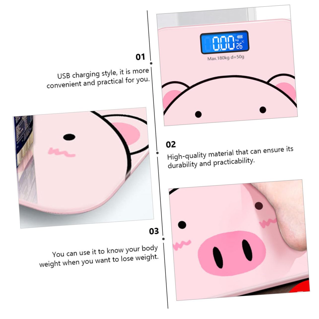 Package Include 1 x body weight scale Features - Display mode: LCD high-definition night vision highly accurate body weight. -Product Info:Electronic weight scale - Material: Tempered Glass electronic scale. - Display accuracy: 2 decimal places accurate body weight scale. - Load-bearing range: 0.2-180kg body weight scales. - Color: Pink weighing scale for body weight. - Size: About 26.00X26.00X2.50cm/10.22X10.22X0.98inch weight scale. - Weighing unit: kilogram or single catty weight scales for people. - Charging method: battery/USB charging weight scale digital. - Material of this electronic body weight scale is durable and safe, you could keep it for a long time digital body scale. - Automatically shut down, more intelligent and more convenient, very practical electronic scales for body weight. - and is always served by us, very economic cartoon scale. - Abandon the original manual design, upgraded to intelligent weight induction, automatically start up on the scale scale for body weight rechargeable. - USB charging function design, very easy and simple to charge home scale for body weight.Goods Informationweight scale Are you still looking for a practical and lovely electronic body weight scale? Are you in search of a sturdy, trustworthy tool that can do multiple jobs at once? , ! This body weight scale must meet your needs.scale for body weight rechargeable It is one of the for you