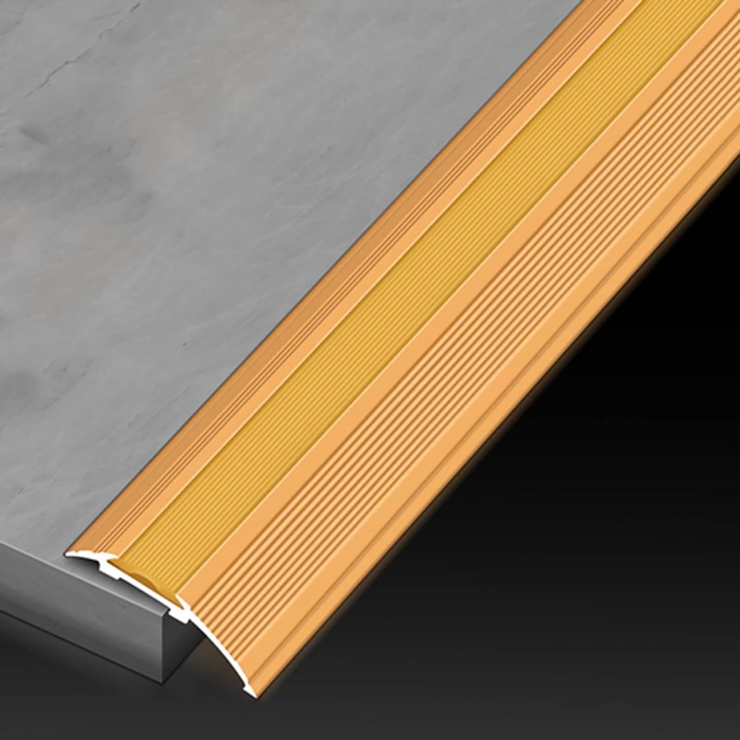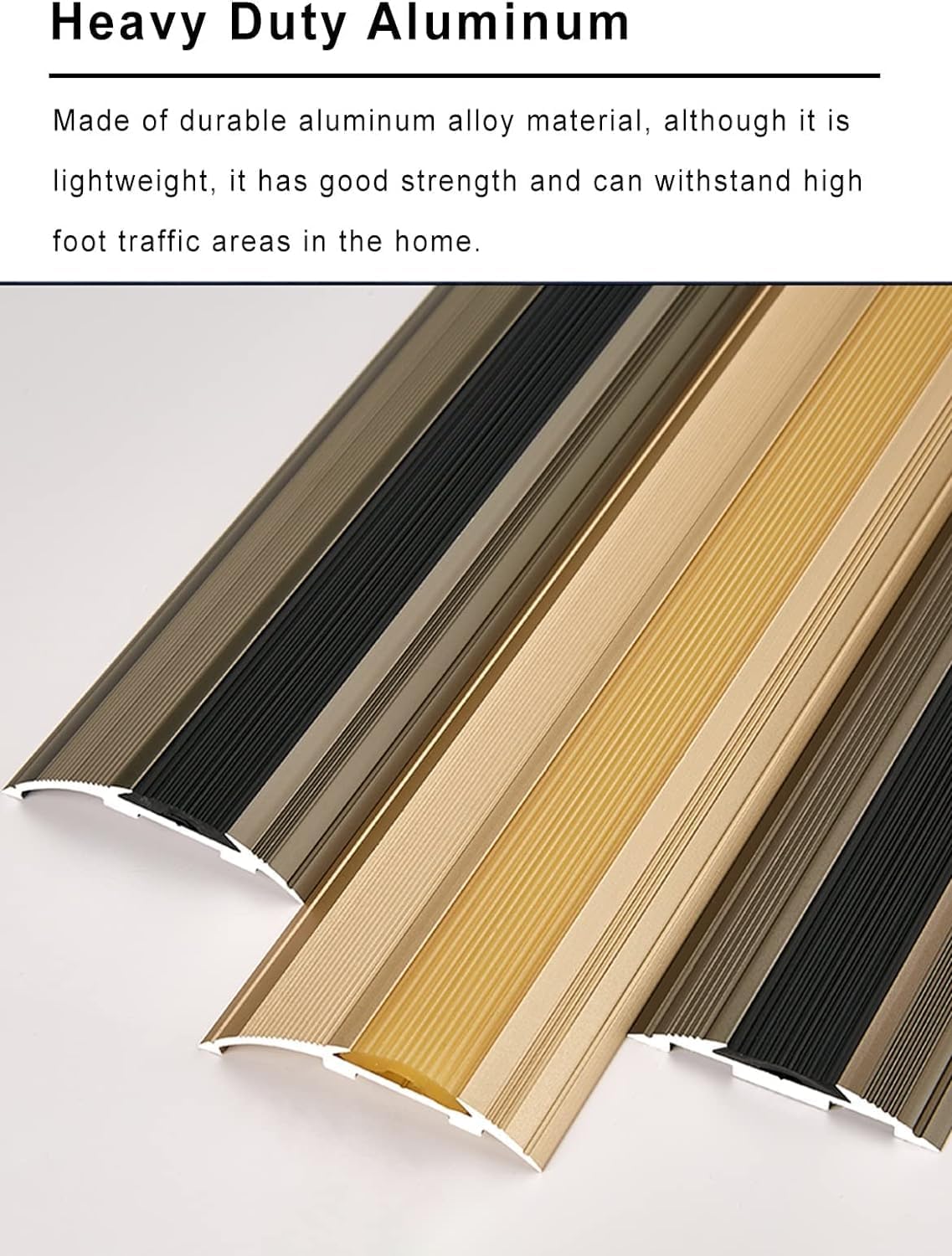 ◆ Aluminum alloy flooring transition strips, cover the seams or gaps between two floor surfaces and protect the edges of the floor, suitable for doorways, room entry ways or other locations. Beneficial to protect children or the elderly, and is not easy to trip, make your home nice and safe.◆ Specification:- Material: Aluminum Alloy- Width: 55mm (2 1/8")- Length: 270cm (106 1/4")- Suitable for Drop: 10mm-30mm (3/8")"- (1 1/8")- color: Black, Gold- Max Load: 250 kg/550 lbs- Cuttable◆ Package List:- 3 x 90cm Floor Transition Strip ◆ Features: - Aluminum Alloy Flooring Transition Strips- No Nails/ Screws Needed- Easy to Clean & Not Easy to TripEdge Trimming DecorationWithstand High Foot Traffic◆ Note:- Due to package length limitation, the 270cm transition strip will be divided into 3 pieces of 90cm.- There may be an error of 1-3 cm due to manual measurement.- There may be chromatic aberration due to the difference between the recording lamp and the display. Please refer to the actual product.◆ Quality Service:- When you encounter any problems with our products, please feel free to contact us, and we will try our best to solve them for you. If you leave a message in the review or feedback, we can't find it in time and solve, you can tell us by message. Thanks!