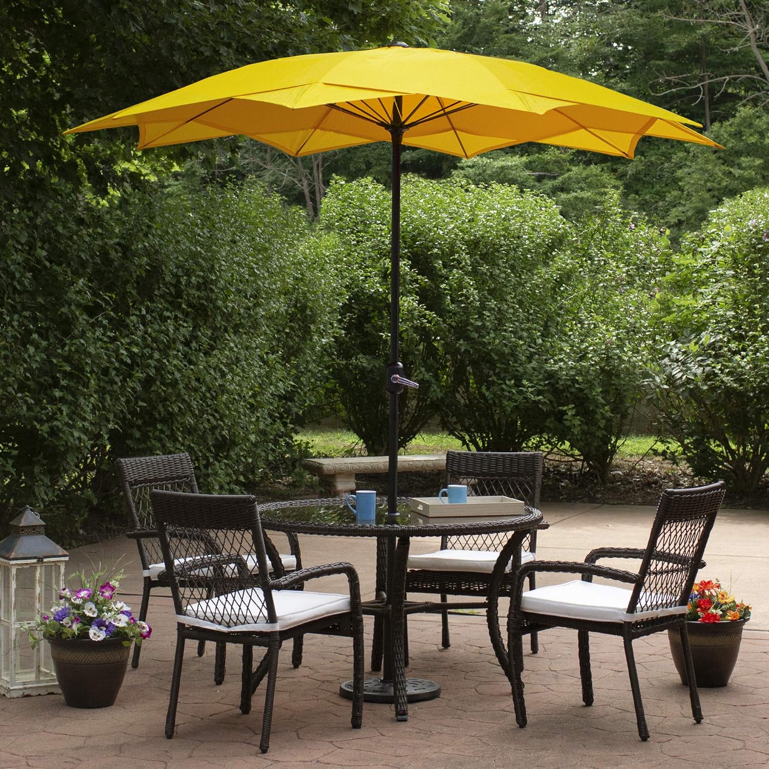 Add shade and functionality to your outdoor living space with this richly colored patio lotus umbrella. Comprising a sturdy, powder-coated aluminum frame with fiberglass ribs, this tall, modern-style umbrella is built to last a lifetime. The crank opening enables easy use and offers the perfect coverage for a table and chairs. Features:. Umbrella shape: lotus. Canopy color: yellow. Frame and pole color: brown. Unique "lotus" shape is achieved by layering one 5-point star shape on another for a total of 10 points around. Diameter of open umbrella: 8.85'. Height: 8.2'. Pole diameter: 1.5" (38mm). Lift: hand crank. 10 ribs. Material(s): 160 gram polyester canopy/powder-coated aluminum pole/fiberglass ribs Note: Umbrella only, base is not included