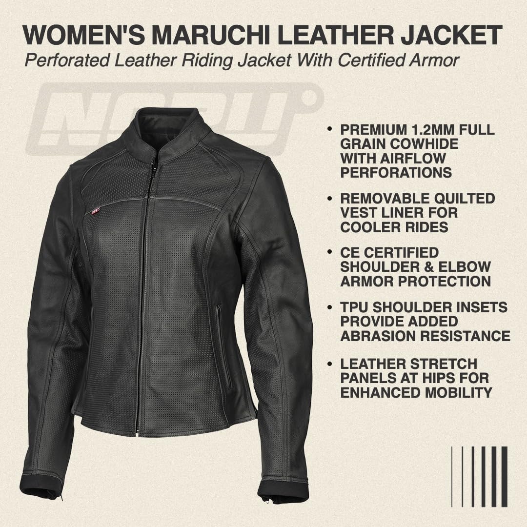 The Women's Maruchi Leather Jacket combines classic style with modern performance, crafted from premium full-grain leather for durability and comfort. Designed with a flattering, functional fit for women, the jacket features airflow-punched panels on the front, back, and sleeves to keep you cool. The quilted, zip-out liner provides warmth when needed, while the breathable mesh inner lining ensures comfort on warmer rides. With a focus on both fashion and function, the jacket includes practical features like zip-entry hip expansion, a neoprene comfort cuff, and a low-profile collar with padded trim for added comfort. It offers multiple pockets, including a wallet pocket, zip-entry front pockets, and a phone sleeve. Reflective piping enhances visibility in low light, and the short connecting zip for pants makes this jacket versatile for all riders. The Women's Maruchi Leather Jacket is the perfect blend of style, comfort, and performance.