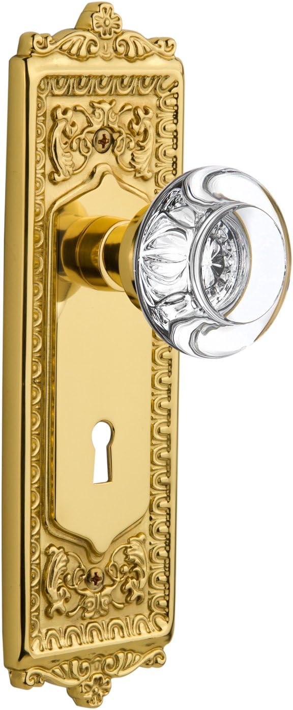 Product Description Enhance the elegance of your doors with the Nostalgic Warehouse Egg & Dart Plate and Round Clear Crystal Door Knob. Crafted with precision, this set features solid forged brass plates and genuine lead-free crystal door knobs for a detailed and clear design. The distinctive repeating border detail, floral crown, and foot of the Egg & Dart Plate add grand style, making it the ideal choice for interior doors. The circular shape of the Round Clear Crystal Door Knob magnifies the beautiful facets underneath, bringing the past alive. These door knobs are mounted on a solid forged brass base, ensuring durability and beauty. Perfect for restoration projects and easy installation on modern pre-drilled doors, this high-quality hardware is hand-assembled in the USA and comes with a 5-year warranty. Elevate your door's style with the Nostalgic Warehouse Crystal Door Knob set. From the Manufacturer With its distinctive repeating border detail, as well as floral crown and foot, the Egg & Dart Plate in polished brass resonates grand style and is the ideal choice for larger doors. Adding our Round Clear Crystal Knob, which features a circular shape that magnifies the beautiful facets underneath, only serves to bring the past alive. All Nostalgic Warehouse knobs are mounted on a solid (not plated) forged brass base for durability and beauty.