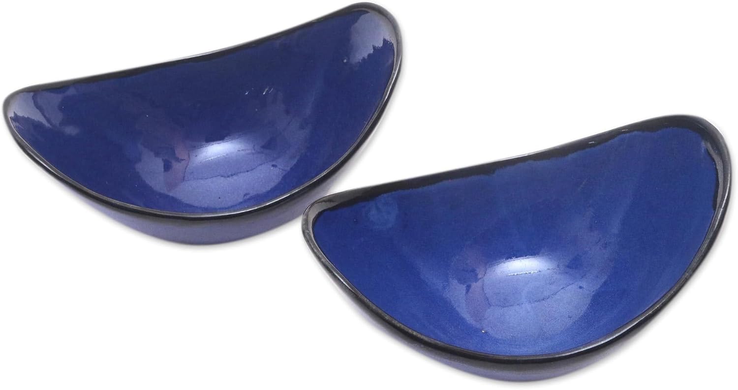 Novica works together with talented artists, artisans, and designers around the world to produce stunning, keepsake handmade treasures.About this item: Shaped like long canoes, this pair of serving bowls makes the perfect kitchen accessory for presenting dips and other hors d'oeuvres. Balinese artisan Putu Oka Mahendra designs these bowls, which are handcrafted from ceramic and treated with a shiny blue glaze.Dishwasher safeFood safeHand-crafted item -- color, size and/or motif may vary slightlyMicrowave safeAbout our Artist: Balinese artisan Putu Oka Mahendra inherited his ceramic legacy from his mother, Made Tantri, who pioneered ceramic artistry in 1980. At first, she undertook the entire design and crafting procedure by herself, and developed a reputation for fine design and high quality. In 1990, when Tantri passed away, Oka Mahendra took-over her work, and eventually opened a showroom in her memory. The award winning designer finds inspiration in the luscious flora and fauna of Bali.