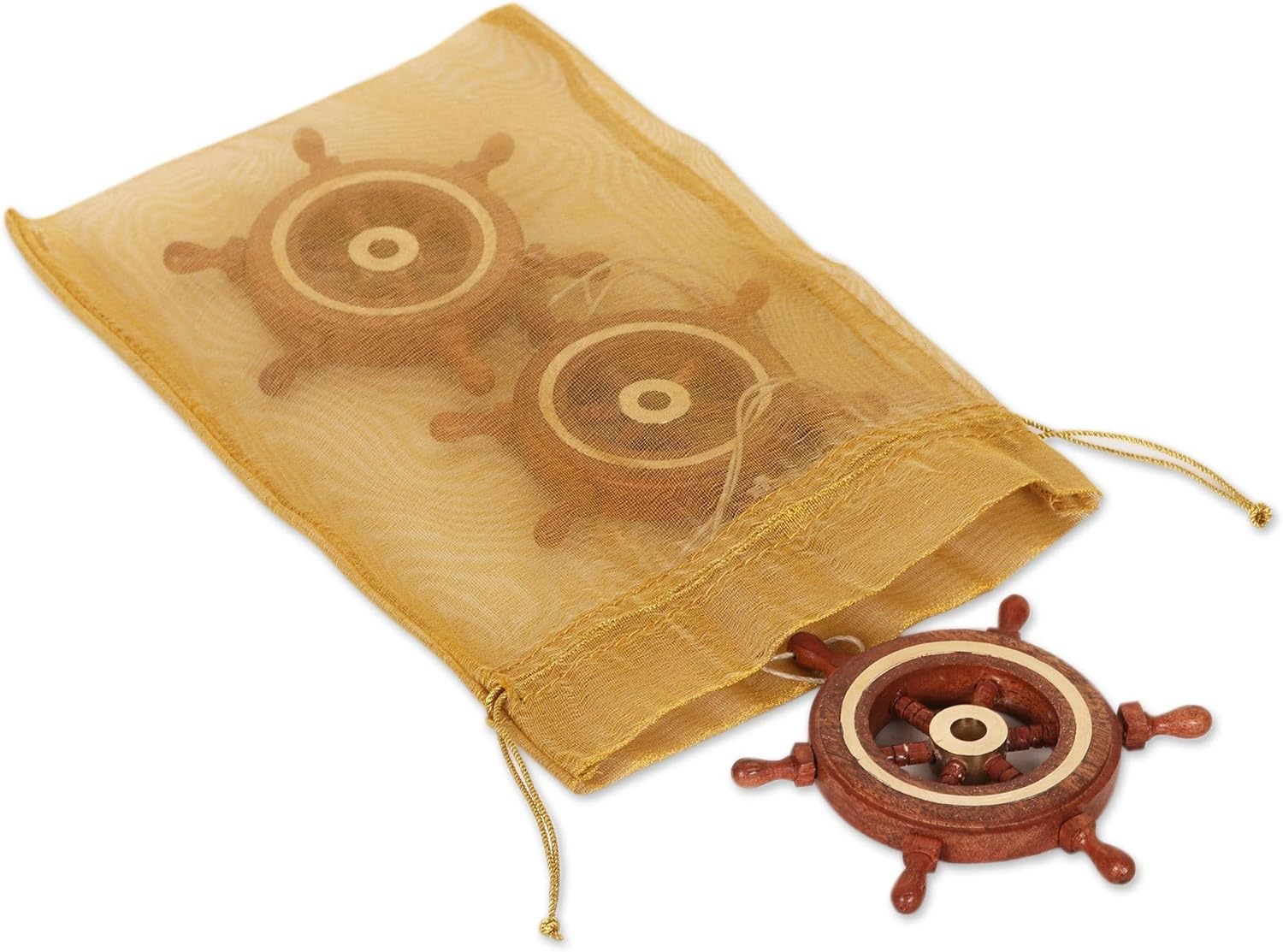 Novica works together with talented artists, artisans, and designers around the world to produce stunning, keepsake handmade treasures.About this item: India's Dinesh presents this set of three ornaments, perfect for anyone on your "nauty" list. Three acacia wood ship's wheels are accented by brass and come ready for gift-giving in an organza pouch.Hand-crafted item -- color, size and/or motif may vary slightlyWood grain and color can vary slightlyAbout our Artist: 'I was born in Calcutta. My family soon shifted to New Delhi where I did my schooling and college. My interest in India's crafts led me to earn a diploma in export management. With this in hand, I began coordinating sales for several artisans from different parts of India. I organized a small group of artisans working in different materials and styles. Currently, I've 15-20 artisans working with me in stone, wood, metal art and small gift items. Together, we make beautiful pieces for the world to see and appreciate.'