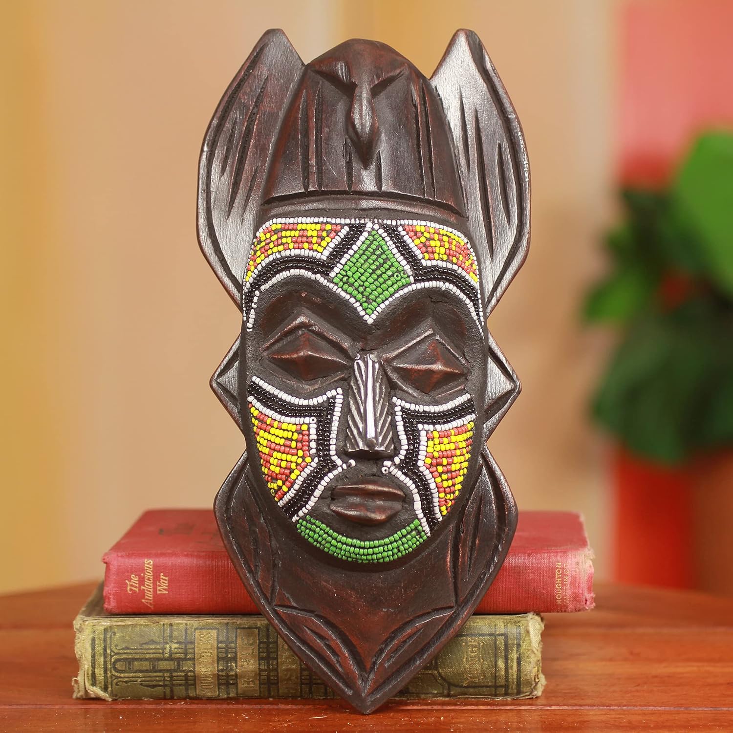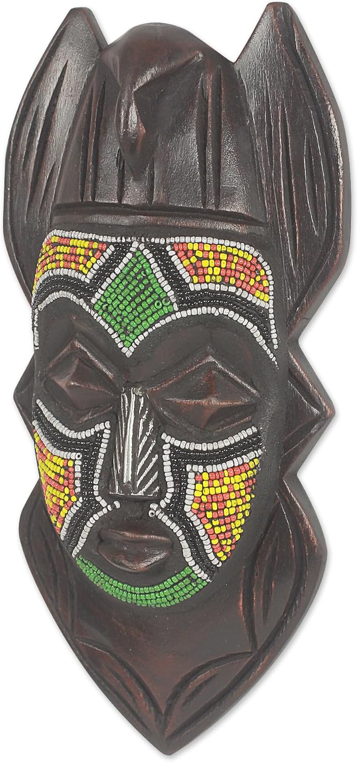 This African mask is handcrafted from local sese wood by Awudu Saaed, decorated with multicolored recycled glass beads around the face and embossed aluminum over the nose. Striking and noble, the mask depicts a dove atop a man's head, named Anoma Ba, meaning "bird's child" in the Akan language of Ghana.