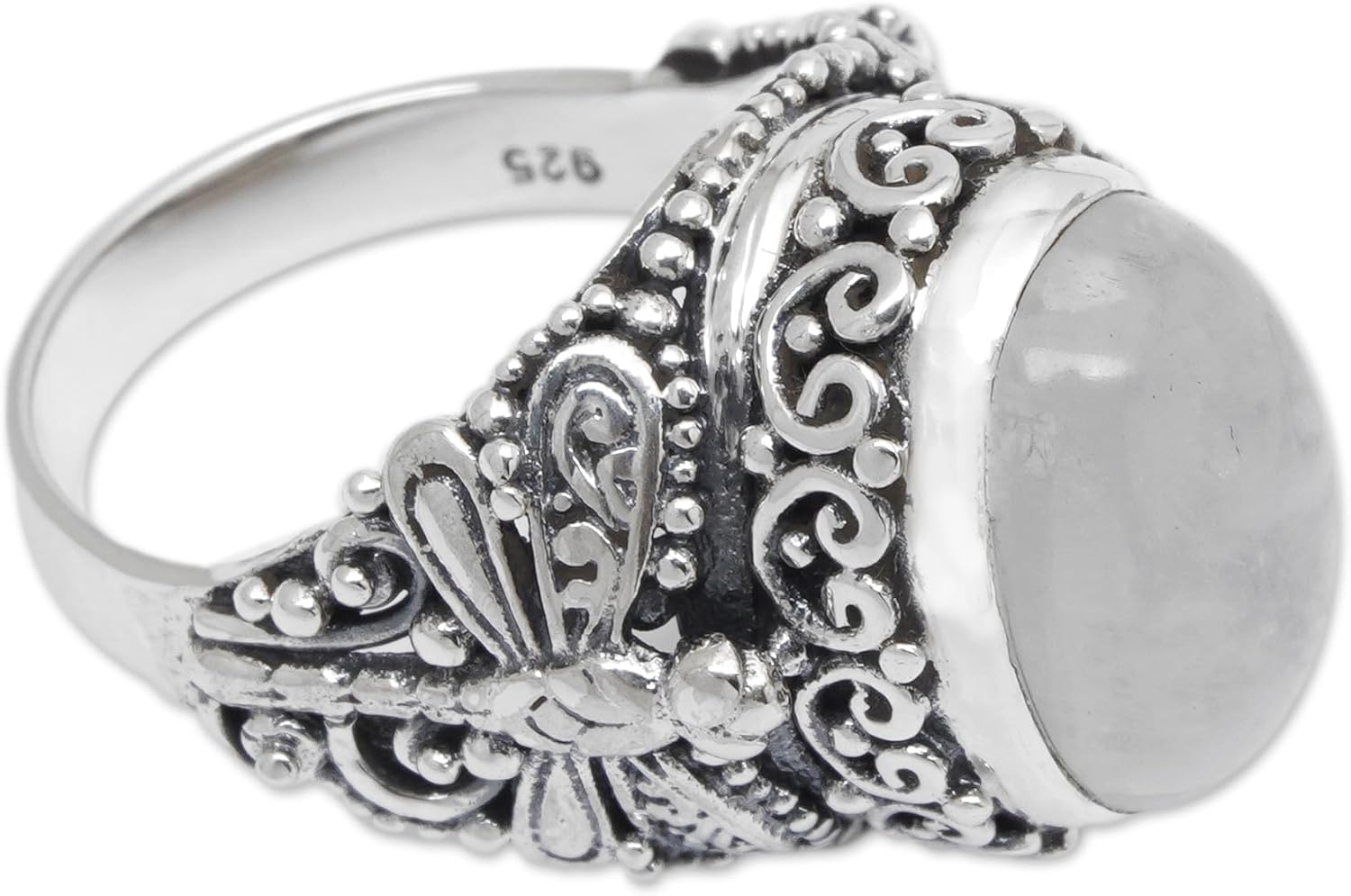 Novica works together with talented artists, artisans, and designers around the world to produce stunning, keepsake handmade treasures. Our mantra is to Spread Happiness, so rest assured - we’ll do everything we possibly can to ensure you’re a happy customer!About this item: Dragonfly wings spread their enchanting aura in this traditional Balinese cocktail ring, decorated with the region's classic details. Oxidized and polished finishes merge in each sterling silver motif???all illuminated with a moonstone cabochon set at the front of the design.About our Artist: Update (May, 2019) My name is I Wayan Buana. I was born in Sukawati, Bali in 1974. My father was a civil servant while my mother was a food seller. I'm the oldest of four . I remember my hood was so happy. My parents really loved and took care of their well. Because our family's economic condition was so limited, I worked after school so I could pay the school fees for my siblings, and also help my parents. I like sports like badminton, and I often exercise near my house. In Sukawati, most of the villagers are wood carvers, silversmiths and clothing sellers. It's also famous because of its rich culture and arts. For those who are looking for inspiration, you can find tons of ideas amid Bali's tranquil atmosphere and beautiful scenery. My enthusiasm for silver jewelry crafting started when I was still in the 6th grade. The father of well-known featured artisan Komang Wijayana was the one who taught me. Once I was around 15, I was finally able to create jewelry by myself and help out with orders from clients. I married a Balinese woman who had been in a relationship with me since junior high school, and now we've been blessed with two daughters and a son. The period shortly after we got married was our most difficult. The economy wasn't good at all. Many people took my silver jewelry on consignment but didn't pay, and I had to sell my work...