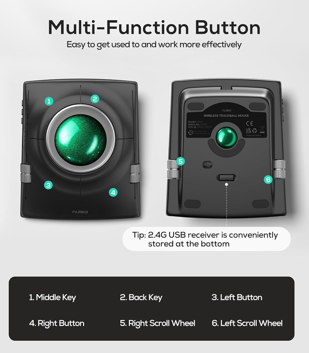 Nulea M512 Wireless Trackball Mouse, Ergonomic 55mm Trackball, Adjustable DPI for Precise Control, Left or Right Hand Compatible, Rechargeable, Multi-Device Bluetooth & 2.4GHz for PC, Laptop(Green)