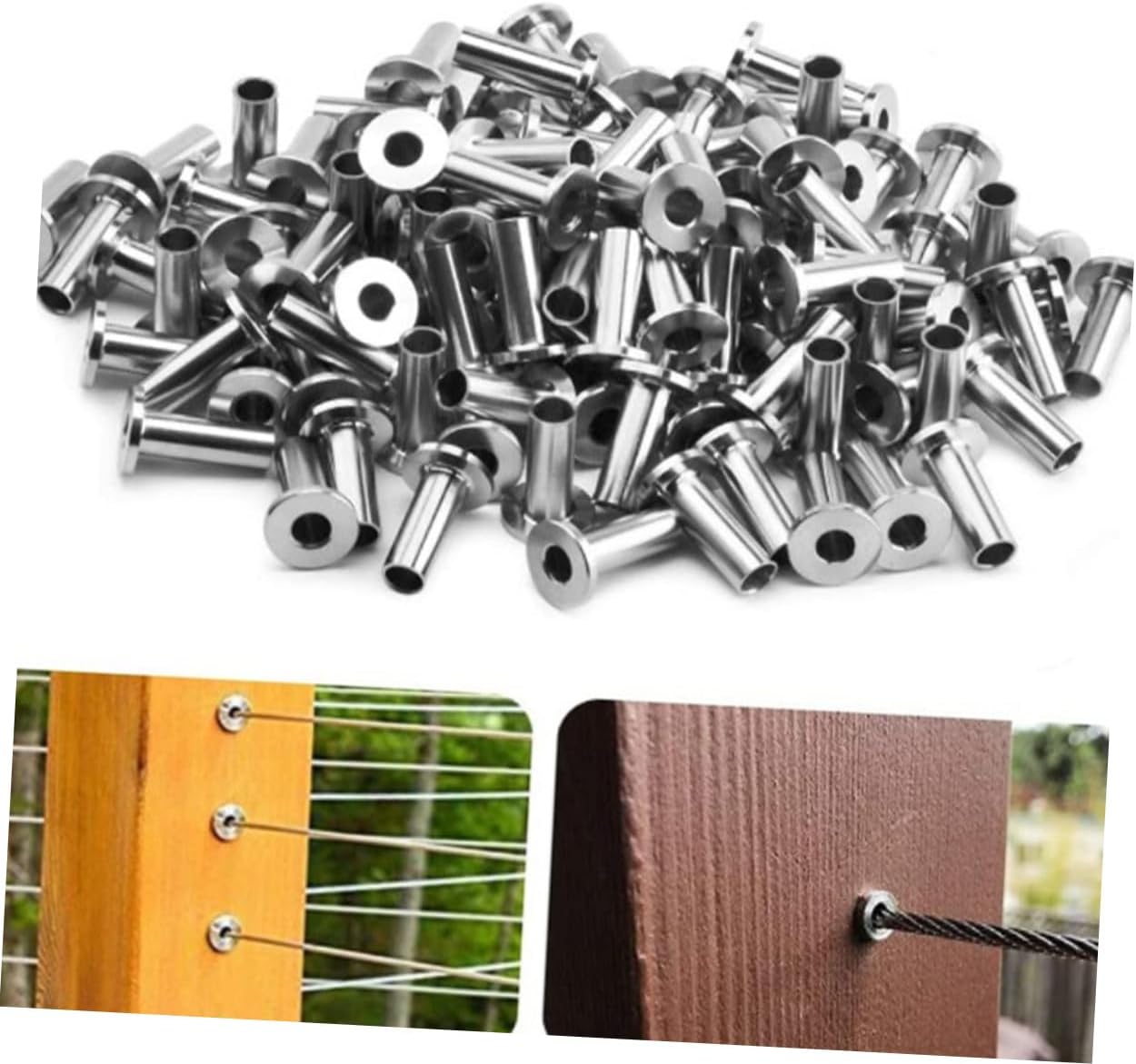 Package Include 65 x protective sleeves 1 x drill bit Characteristics - Size: 2.00X1.22X0.64cm/0.79X0.48X0.25 inch Cable Protector. - Color: Silver Wire Rope Protector. - Material: Stainless steel Wire Protective Sleeve. - And can keep maintaining cable rail tension for preventing wire rope vibration Cable Railing Kit. - You will receive 65 pieces cable protector and 1pc drill bit, sufficient quantity to meet your daily demand Deck Cable Protector. - It's made of stainless steel. Put them outside and unaffected by it Deck Cable Protective Sleeve. - Suitable for deck cable railing. for indoor or outdoor applications DIY Cable Protective Sleeve. - These protector sleeves prevent cable from wearing into post and prevent damage cable Cable Protectors.Goods DescriptionCable Protector Made of stainless steel, and .Wire Protective Sleeve A for protecting deck cable.DIY Balustrade Cable Protector Stainless steel protective sleeves are easy to use.Sleeve for Cable Railing Easy to install and the cable will certainly have no trouble passing through.Cable Protective Sleeve It is a very protective accessory that will meet your needs well