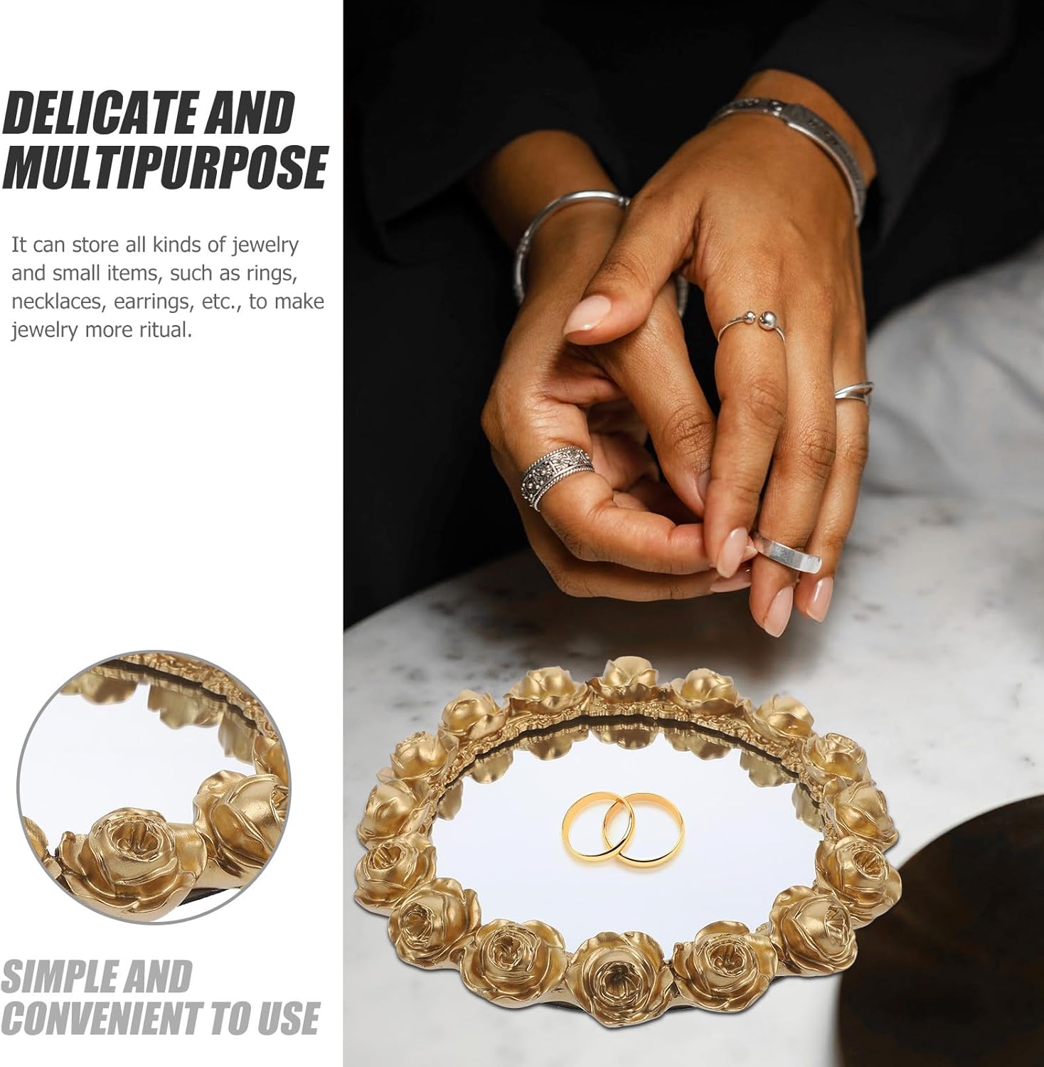 Package Include 1 x Jewelry Tray Characteristics -Product Info:Mirror roses and fruit tray -Size:26.00X26.00X3.00cm/10.22X10.22X1.18in -Color:Golden -Material:Resin - Keep your jewelry in order and easy to Convenient and decorative, saving space when not in use tray for dresser. - Elegant, beautiful and practical decorative tray can hold jewelry, accessories, rings, earrings, perfume bottles, keys and so on vintage perfume tray. - Fine workmanship, the resin tray with simple and smooth lines, good embellishment for long-serving time decorative vanity tray. - High-end design, good decoration effect. The jewelry display tray is made of resin material, and practical. - Suitable for dressing table and jewelry store display tray. Unique shape and beautiful design, and the texture is well fragrance holder tray.Goods Informationtray decor perfume Its round shape design and workmanship which giving a comfortable and generous feeling.fragrance holder tray It can add a noble atmosphere for your home.jewellery trays This tray is well-made of premium and safe materials.perfume plate Multifunctional, can be used as a jewelry storage holder, also a decoration