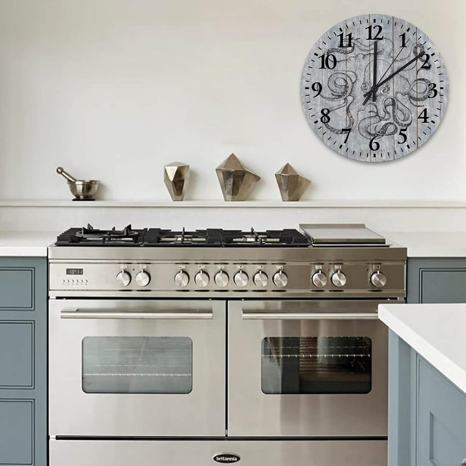 Ocean Animal Octopus Wooden Wall Clock Seashells Sea Themed bathroom clock Silent Non-Ticking Battery Operated Arabic Numeral Clock Dining Room Decor 15 Inch??Details:Product Size: 10/12/15 inches, (25/30/38 cm)Shape:RoundMaterial: Wood??Functional Home DécorThis Ocean Home Decor clock aren't just for timekeeping. They function as beautiful wall decor pieces, beyond telling time, and bring both style and purpose to any room.A charming home decoration, very suitable as a housewarming gift, making the home more warm. Suitable for any room, you can put it in any room such as home, living room, master bedroom, kitchen, bathroom, home office, etc. Elegant, durable and stylish.??Clock Hands Troubleshooting Guide:Check that the battery is a new battery and not a used battery.Make sure the hour and minute hands are not crossing or touching each other. If they are, adjust the hands by slightly bending them.See if the center pin that holds the hands together is firmly pushed in or screwed on, depending on the style.If hands are still not moving after the above, please reference the hands replacement instructions included with all of our open face clocks.