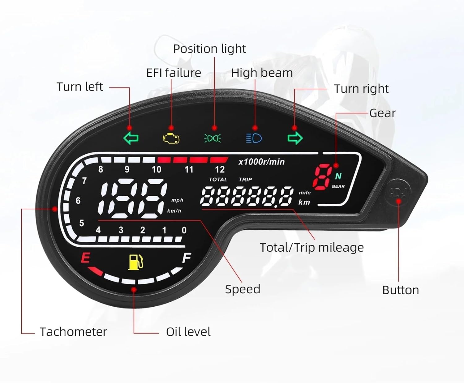 The Motorcycle Meter Display Speedometer craftsmanship, sturdy and durable, not easy to damage, reliable quality, can bring you a comfortable experience.Motorcycle Speedometer 12V Universal Multifunctional Moto Gauge Digital Odometer For NXR150 NXR125 Bros 2003-2014 Features :The digital screen is sealed with epoxy resin (soaking in water for a few days is no problem)Automatic photosensitive adjustment: not dazzling at night, and can be seen clearly in the sun.Large-screen full anti-glare display; automatic photosensitive adjustment function: no glare at night, but during the day.Color: blackMade of: ABSFor NXR150 NXR125 Bros 2003-2014 For CRV XR150 GY200 For Mexico For Brazil For ColombiaOdometer: six digits, minimum 0.1kmIndication function: left turn signal, high beam, right turn signalFile display function: N lights, 1-5 filesAlarm function: low oil volume alarmPackage:1X Motorcycle Digital Odometer