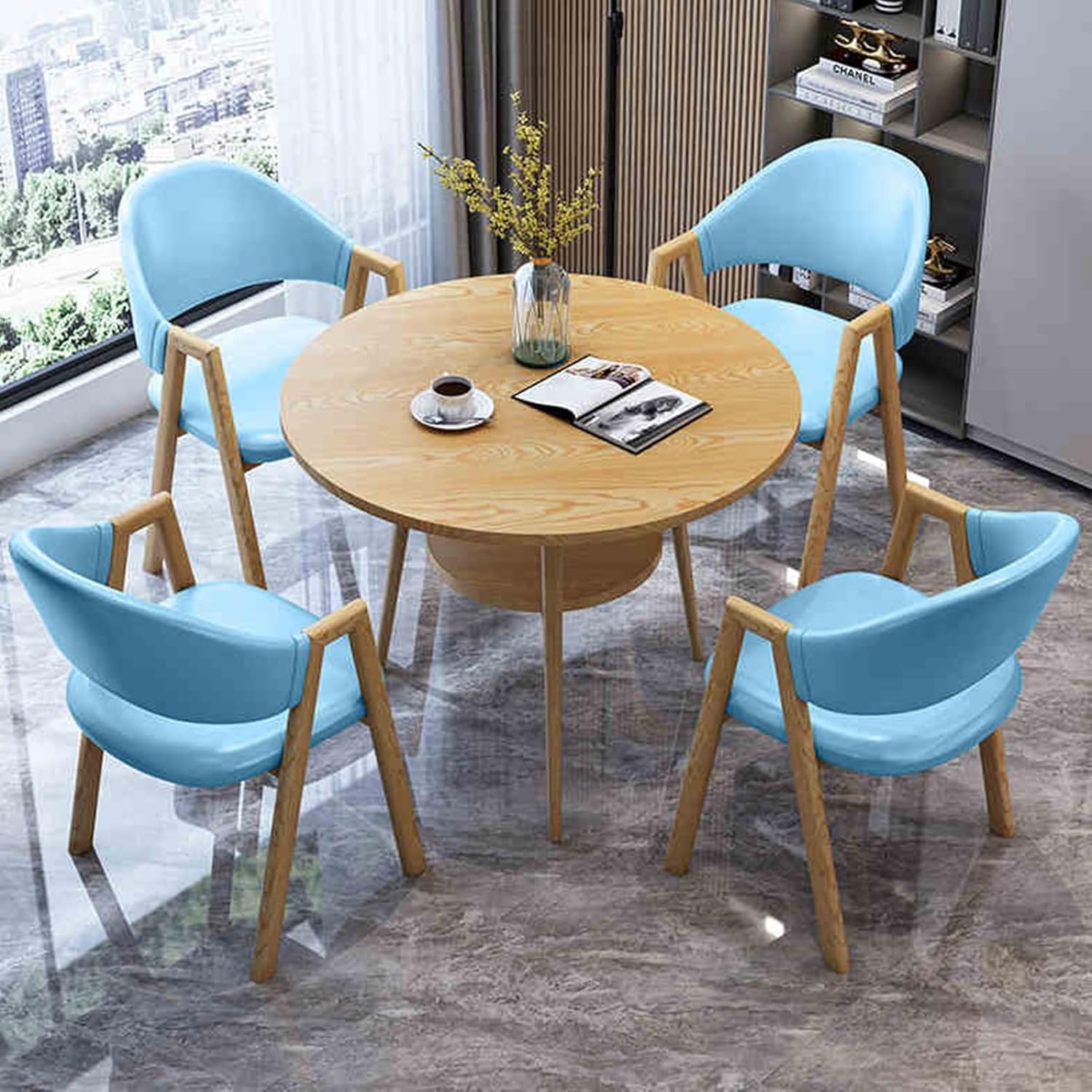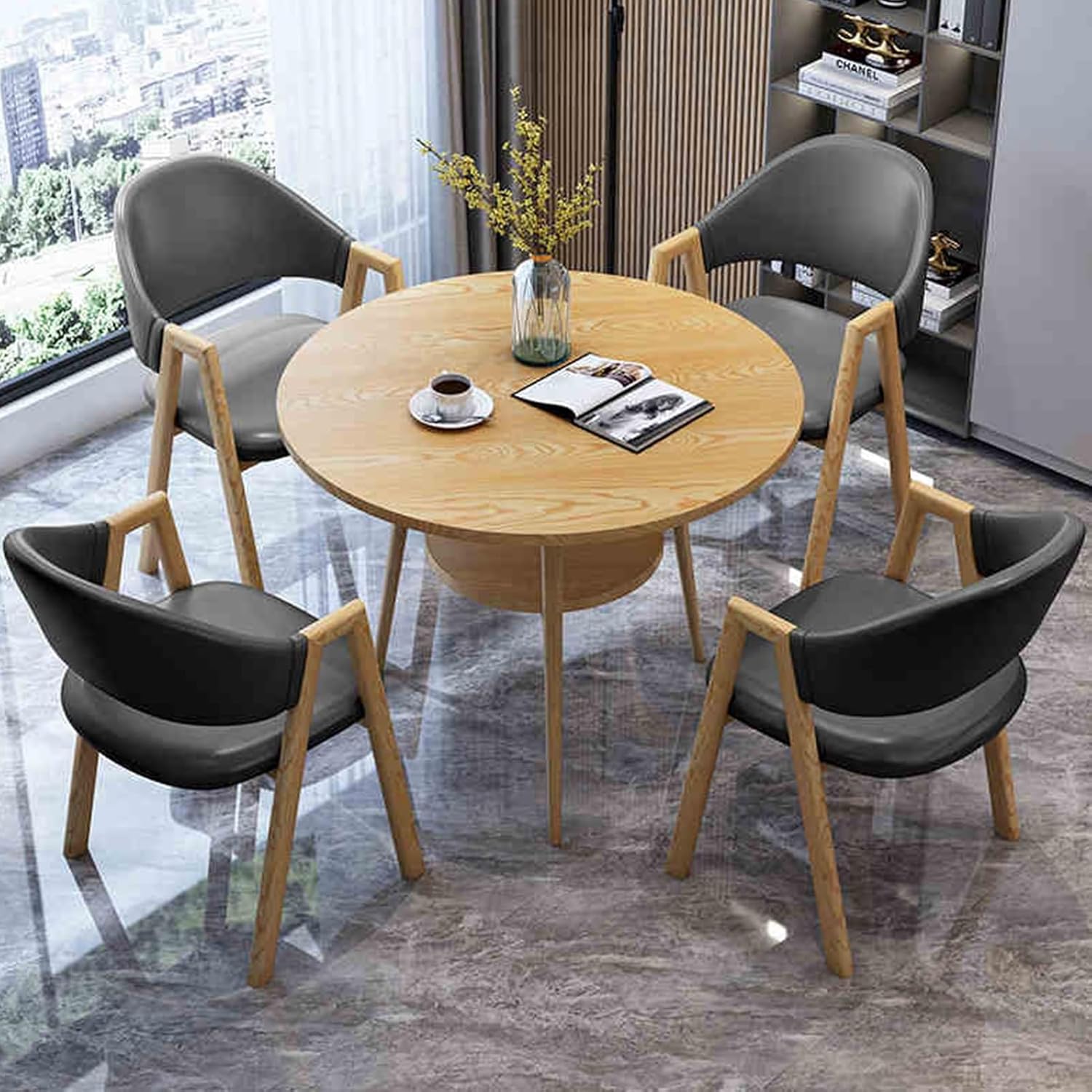 Comfortable sponge seat bag/backrest, moderate hardness, good resilience, durable, refuses to collapse, making every sitting and standing more comfortableProduct Name: office reception room club table and chair setTable material: E1 grade high density boardChair material: PU leatherTable size: diameter 80cm/31.4inPacking: 1x table, 4x chair (other things are decorations, not included)Applicable scenes: office, coffee shop, tea shop, reception, restaurant, library, cinema, clothing store, maternal and child shop, living room, etc.Please note:1. While we display colors as accurately as possible, due to differences in computer monitors, colors may vary.2. Due to manual measurement, there may be an error of 1-3 cm in the product size.
