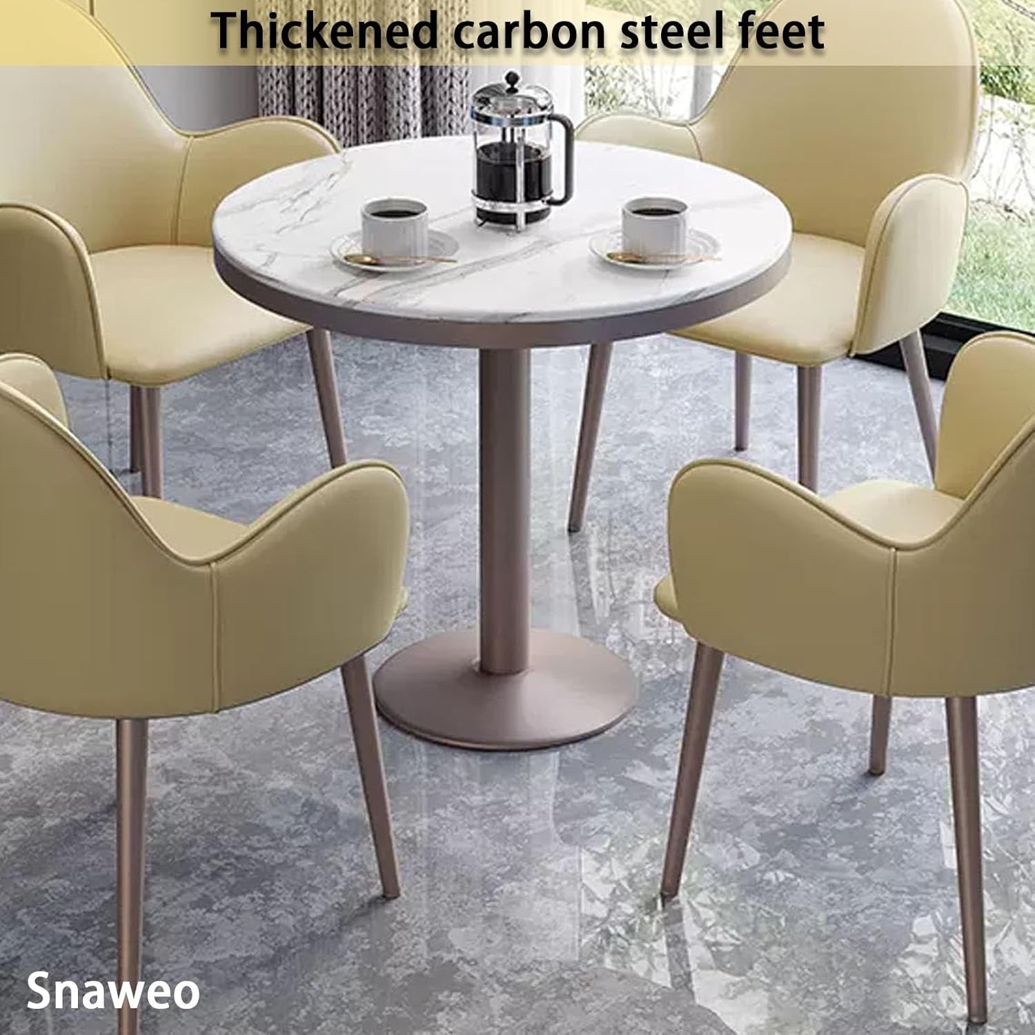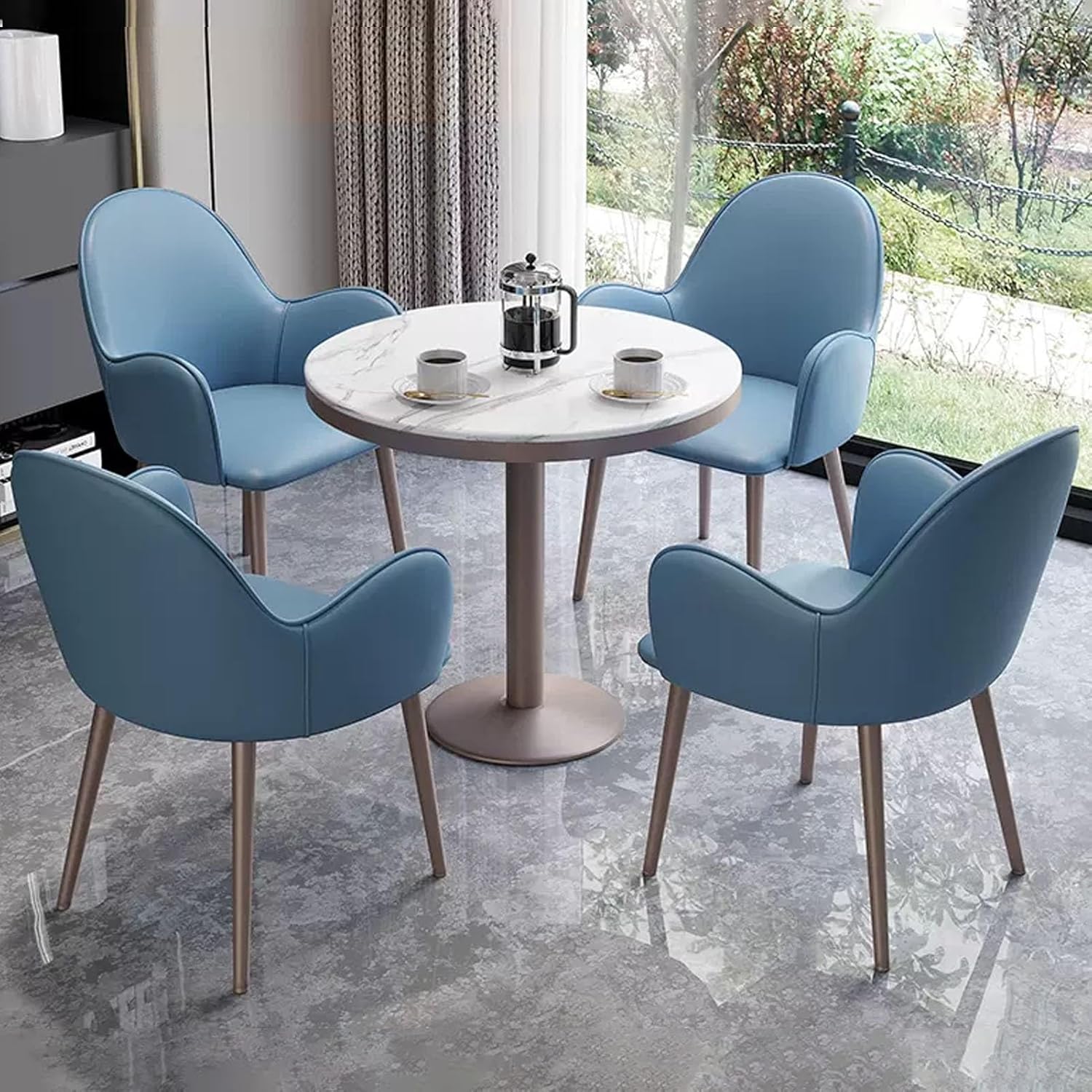 The right size is perfect for small meeting rooms or guest reception rooms without taking up too much space.Backrest Chair equipped with non-slip foot pads to prevent floor scratchesThe back of the chair adopts an arc design, which completely wraps around the lumbar region and provides a comfortable sitting positionProduct parameters:◆ Product name: office reception club table and chair set◆ Color: Light gray, Yellow, Dark gray, Blue◆ Table shape: round◆ Table material: marble slate tabletop◆ Table and chair leg material: metal◆ Table thickness: 2.5cm/1in◆ Table diameter: 80cm/31.5in◆ Table height: 75cm/29.5in◆ Chair material: leather fabric + sponge◆ Chair total height: 80cm/31.5in◆ Applicable number of people: 4 people◆ Packing method: assemblyPacking list:1*table,4*chairs (other things are decorations, not included)Warm Tips:1. Size Description: The product is completely measured by hand and may have an error of 1-3 cm. Please refer to the actual items received.2. Picture description: The product is real. Due to problems with light, angle, display, etc., there may be slight chromatic aberration, please forgive me.