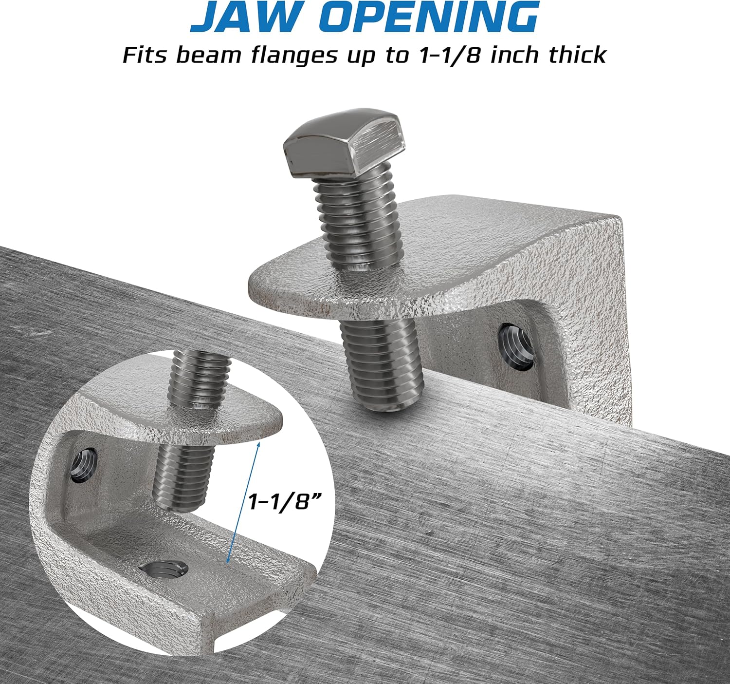 The OHLECTRIC Beam C Clamp (6-Pack) is engineered from durable malleable iron with a zinc-plated finish to provide strong, corrosion-resistant support for structural and mechanical installations. Each clamp features a 1-1/8" jaw opening, 1/2"-13 set screw, and a 750 lb max load capacity, making it ideal for securing threaded rods to I-beams, C-channels, bar joists, and wide-flange beams.Designed for efficient installation without drilling or welding, these clamps offer stable, reliable fastening for electrical, mechanical, construction, and general industrial applications. The threaded hole and locking design ensure firm engagement and secure support.