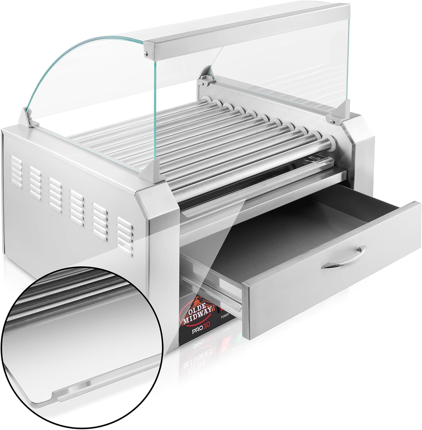 Olde Midway's electric hot dog roller machine with bun warmer and glass cover makes it easy to prepare mouth-watering rotisserie style hot dogs. Cook up to 30 hot dogs at once on the 11 stainless steel rollers. This easily portable but substantial commercial-grade hot dog cooker allows you to cook almost anywhere, without the trouble of a full-size gas grill. The professional-grade construction of this 1600-watt machine is ideally suited for both commercial and home use, including company cookouts, convenience stores, concession stands, birthday parties, sporting events, and more. The stainless steel, non-stick rollers can handle all types of meats, including standard and stadium-sized hot dogs, sausages, and even frozen hot dogs. Easy-to-use, place hot dogs on the rollers, and set temperature to cook. Rollers rotate a full 360 degrees for thorough, even cooking. Dual-temperature controls on the front panel of the hot dog maker allows for continuous cooking on the back rollers, while the front rollers keep the cooked items hot and ready to serve. The bun warming drawer features its own temperature control, also located on the front panel.Includes a removable stainless steel drip tray for fast and easy clean up. Loaded with safety features, these cookers have a built in-fuse, grounded US-standard 120-volt power cord, and non-skid rubber feet. The glass sneeze guard cover keeps your food and the cooking surface free from dust, airborne particles, and insects.Dimensions: 23" (wide) x 19" (deep) x 20" (high), with cover 26" (high)Weight: 47 pounds Olde Midway is well-known within the industry for finely crafted, specialty appliances that combine stylish design with exceptional durability at a great value.