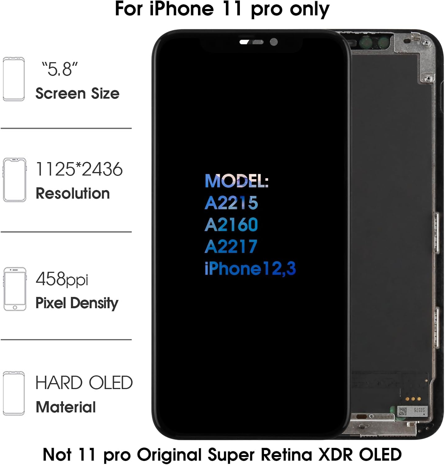 Olivechard OLED Screen Replacement for iPhone 11 Pro This replacement screen assembly is designed for iPhone 11 Pro 5.8-inch models A2215, A2160, and A2217. It includes a complete OLED display and touch digitizer assembly with proximity sensor flex cable, suitable for repairing cracked screens, display malfunction, dead pixels, or touch response issues. Compatible Models For iPhone 11 Pro A2215 / A2160 / A2217 Screen size: 5.8 inches Aftermarket OLED Display This product uses an aftermarket OLED panel and is not an original Apple screen. Compared with standard LCD replacement screens, OLED provides deeper blacks, stronger contrast, and more vivid image performance, making it a more display-focused repair choice for users who care about screen quality. Why Choose OLED Instead of LCD OLED screens offer a different viewing experience from LCD replacements. With darker blacks and stronger contrast, OLED is better suited for users who want a screen option closer to the visual characteristics of the original OLED display structure rather than a basic LCD repair alternative. Important Structure Differences Because this is an aftermarket OLED replacement, some differences from the original screen may still exist, such as: Slight variation in color tone or brightness Slightly different panel thickness Possible minor differences around screen edges This replacement is intended to restore normal display and touch functionality while providing an affordable OLED repair option. Installation Guidelines Power off the device before repair. Disconnect the battery flex cable from the motherboard before installing the screen. Handle the OLED panel carefully and avoid excessive pressure. Do not bend the flex cable excessively. Test the screen before applying adhesive or completing final installation. Professional Installation Recommended OLED panels are fragile components. Users without repair experience are advised to use professional repair services to reduce installation-related damage risk. Package Includes 1 × OLED Screen Replacement Assembly for iPhone 11 Pro 1 × Screwdriver Set 1 × Pry Tool Kit 1 × Waterproof Adhesive Seal 1 × Dust Removal Sticker After-Sales Support Each Olivechard screen is inspected before shipment. If any issue is found during testing, please contact support with photos before final installation for assistance. FAQ Q: Is this an original Apple screen? A: No. This is an aftermarket OLED replacement screen. Q: Does this screen include the proximity sensor flex cable? A: Yes. The proximity sensor flex cable is included and pre-installed. Q: Why choose OLED instead of LCD? A: OLED provides deeper blacks, stronger contrast, and a more vivid display than standard LCD replacement screens, making it a better option for users who care about screen appearance. Q: Can I install this screen myself? A: Screen replacement requires proper tools and repair experience. Professional installation is recommended if you are not familiar with phone repair.