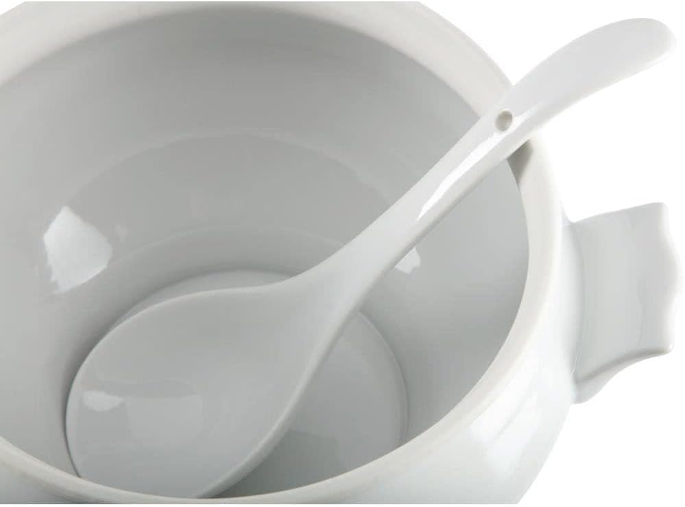 Introducing the Olympia Whiteware Soup Tureen and Ladle - a versatile and durable addition to any kitchen or dining setting. Designed with functionality in mind, this 2.5Ltr (88oz) tureen and ladle set is perfect for serving up soups, stews, and other delicious creations. Crafted from high-quality fully vitrified porcelain, this soup tureen boasts a sleek white colour that effortlessly complements any table setting. The rounded shape adds an elegant touch to your presentation, making it ideal for hotels, restaurants, or cafés where durability is key. Not only is this soup tureen visually appealing, but it's also oven, microwave, dishwasher, and freezer-proof - allowing you to easily heat up or chill down your culinary creations without worry. Its strengthened rolled edges ensure chip resistance and longevity in busy catering environments. Rest assured that this soup tureen and ladle are BS4034 certified suitable for hotel use - meeting the highest standards of quality. With its heat and shock resistance properties, you can trust that this set will withstand the test of time. With the Olympia Whiteware Soup Tureen and Ladle by your side, you can elegantly serve up culinary delights with confidence.