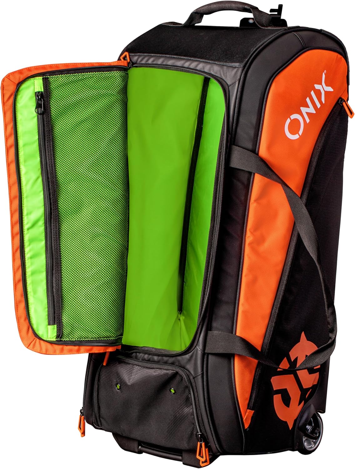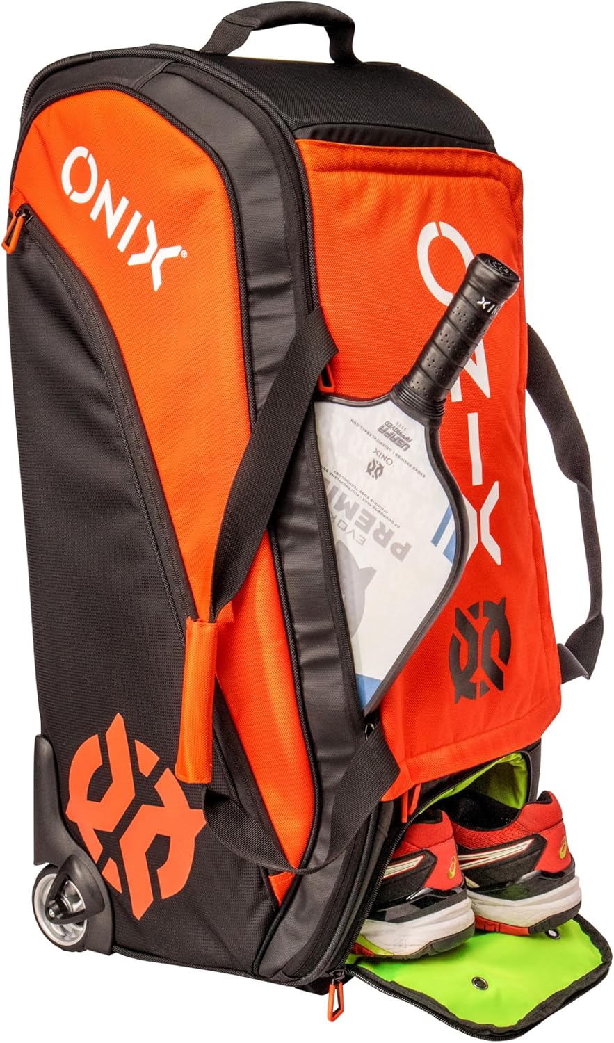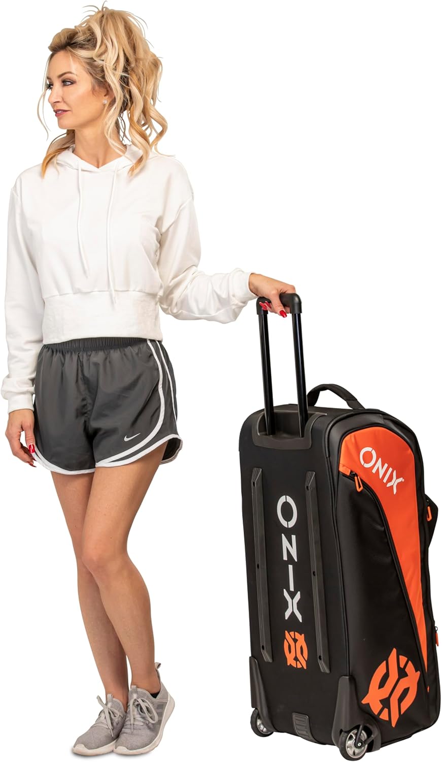 The ONIX Pickleball Pro Team Wheeled Duffle Bag is generously sized to carry all of your pickleball tournament needs and is perfect for big trips. The heavy-duty rolling luggage withstands tough abuse and features four zippered pockets including shoe/wet storage zippered compartment. The wheeled luggage easily glides using the urethane wheels and is pulled by a retractable handle or simply carry the bag using the carry handle with a hook and loop closure. Measuring 31” L x 16” W x 12.5” H, ONIX Pickleball has designed a pickleball bag specifically for your pickleball tournament needs to help you perform even better.