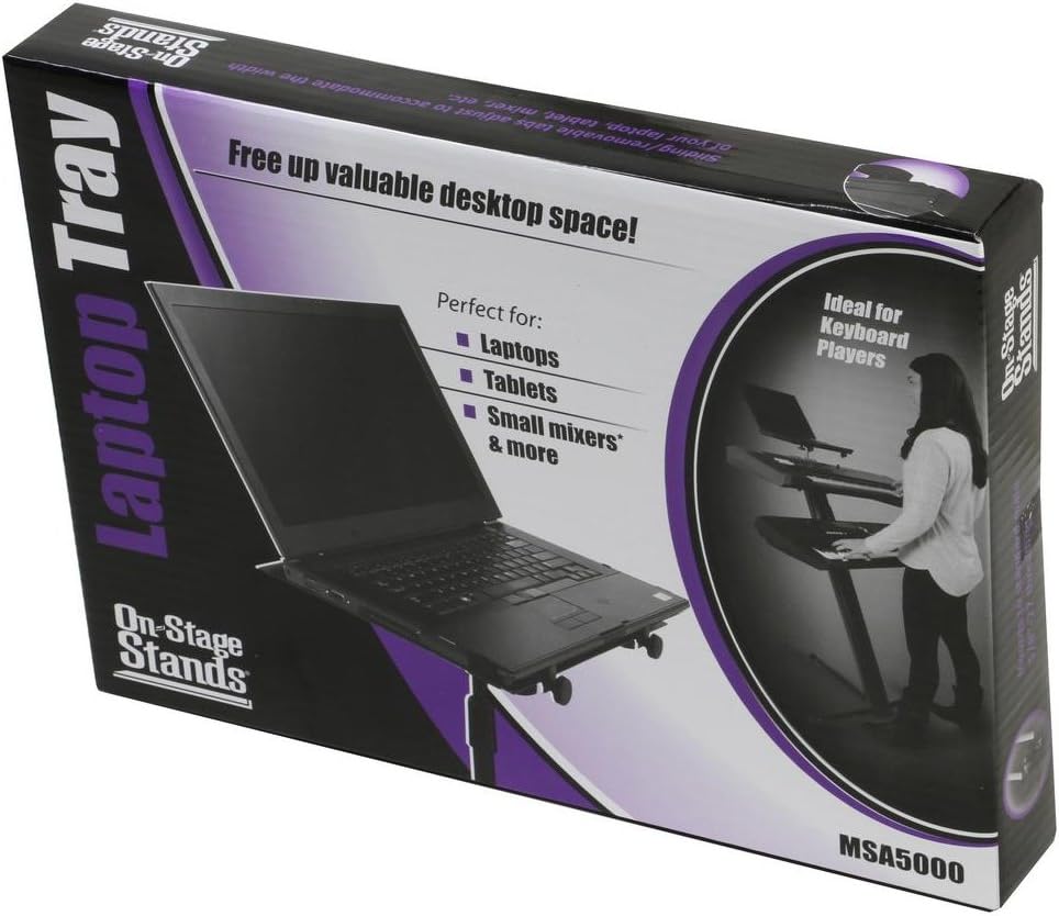Product Description The On-Stage MSA5000 is a versatile solution to incorporate laptops, tablets, and other electronics into stage or studio rigs. It saves valuable desktop space at workstations and allows users to leave bulky trap stands at home for a cleaner stage. Unique to the MSA5000 is its 5/8"-27 threaded adapter, allowing it to be mounted to straight microphone stands. It is also compatible with the On-Stage Stands KS9102 Quantum Core Column Keyboard Stand, along with the KSA7575 and KSA7575+ Mic Attachment Bars for X-frame keyboard stands. The tray of the MSA5000 is 10 deep with an adjustable width from 14" -16.5". Ventilation slots provide air circulation to keep laptops cool, while rear, side, and front tabs keep the device safely in place. These same features make the MSA5000 ideal for small mixers, samplers, recorders, and other devices as well. CAUTION: DO NOT USE with booms, goosenecks or other cantilevered supports From the Manufacturer The MSA5000 is a versatile solution to incorporate laptops, tablets, and other electronics into stage or studio rigs. It saves valuable desktop space at workstations and allows users to leave bulky trap stands at home for a cleaner stage. Unique to the MSA5000 is its 5/8"-27 threaded adapter, allowing it to be mounted to straight microphone stands. It is also compatible with the On-Stage Stands KS9102 Quantum Core Column Keyboard Stand, along with the KSA7575 and KSA7575+ Mic Attachment Bars for X-frame keyboard stands. The tray of the MSA5000 is 10" deep with an adjustable width from 14" -16.5". Ventilation slots provide air circulation to keep laptops cool, while rear, side, and front tabs keep the device safely in place. These same features make the MSA5000 ideal for small mixers, samplers, recorders, and other devices as well. CAUTION: DO NOT USE with booms, goosenecks or other cantilevered supports.