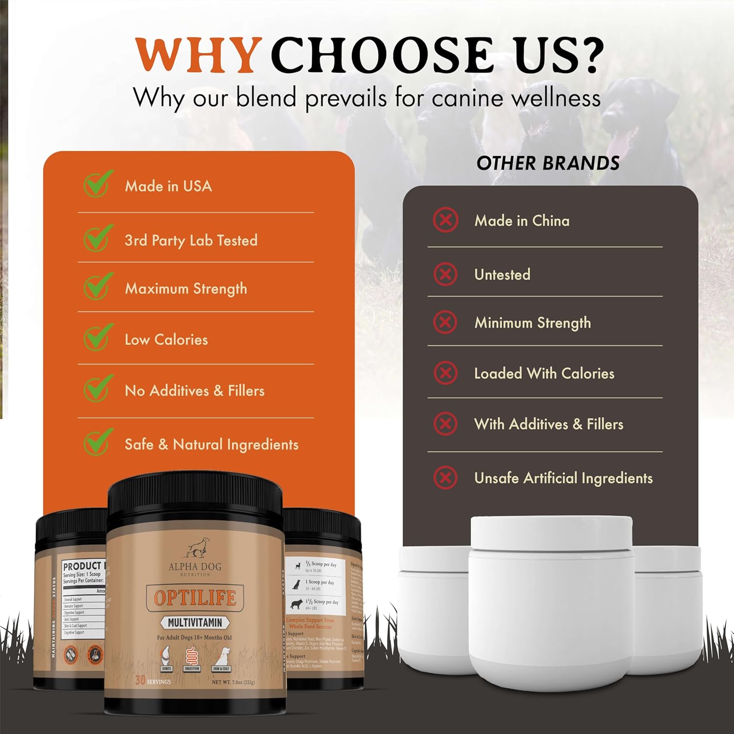 Discover the pinnacle of pet nutrition with Alpha Dog's OptiLife Dog Multivitamin supplement, designed to enhance your canine companion's overall well-being. This comprehensive multivitamin for dogs offers a unique blend of essential nutrients including prebiotics, probiotics, glucosamine HCL, and MSM. Each ingredient is carefully selected to support digestive health, joint function, and promote a shiny coat, ensuring your furry friend thrives at every stage of life. With the inclusion of krill, flax seed, desiccated beef liver, and vitamin B1, these dog vitamins stand out as a superior choice among dog vitamins and supplements. Whether aiding in cognitive support or boosting their immune system, OptiLife promotes a vibrant life for your pet. Perfect for small breeds to large breeds, the supplement adapts to various dietary needs, making it an indispensable part of daily canine nutrition. Embrace the difference that the best dog vitamins and supplements can make in your dog's life. OptiLife offers a balanced approach to multivitamins for dogs, ensuring your beloved pet maintains an active, healthy lifestyle. Give your dog the nutrition it deserves with Alpha Dog's OptiLife Dog Multivitamin and observe the transformation in vitality and spirit.