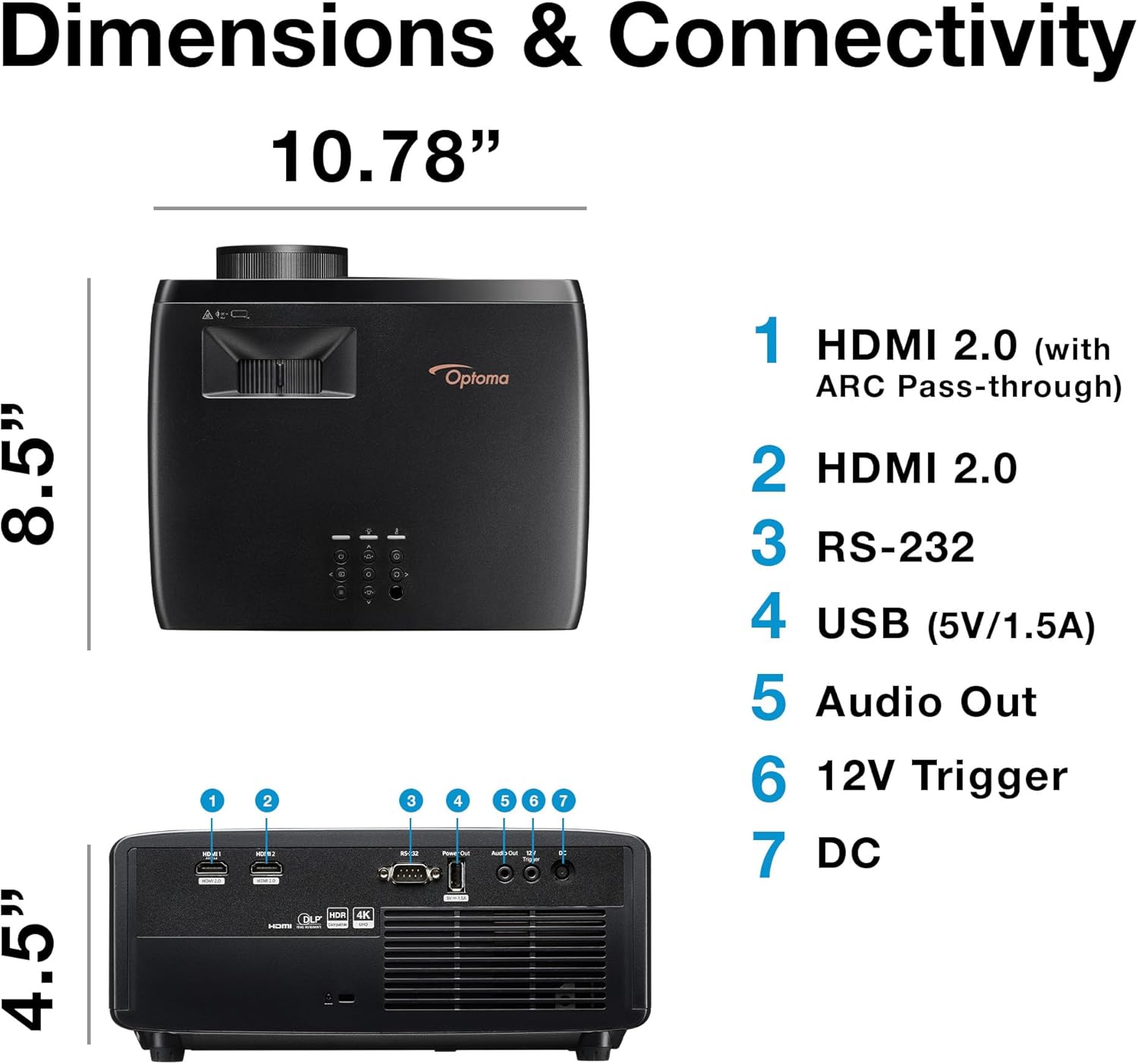 Bring the director’s vision home with Optoma UHZ36, a 4K UHD laser projector delivering ~3,500 ISO lumens. Filmmaker Mode preserves true frame rate, color, and aspect ratio; MEMC keeps sports smooth. DuraCore laser lasts up to 30,000 hours. HDR with Rec.709, Pure Detail/Contrast, HDMI connectivity, and 15W speaker simplify setup.