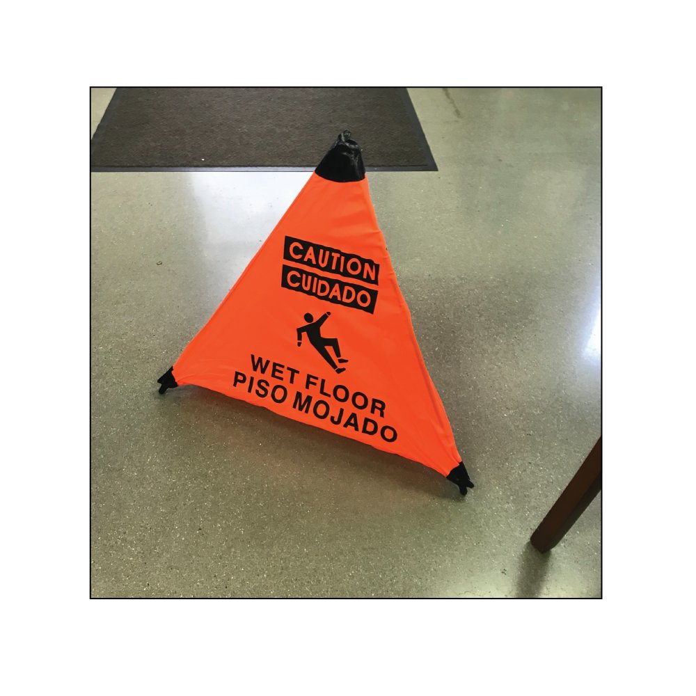 Made out of a bright orange fabric to easily identify that any passerby's should be weary of the wet floor With its height of 18" the sign is easily visible from nearby distances, perfect for warning pedestrians to caution their steps as they are progressing toward the sign the included mount tube makes the sign easy to spot from far away The storage case easily folds back in and can be stored for future use Absolutely no assembly required, simply pull out of case and use