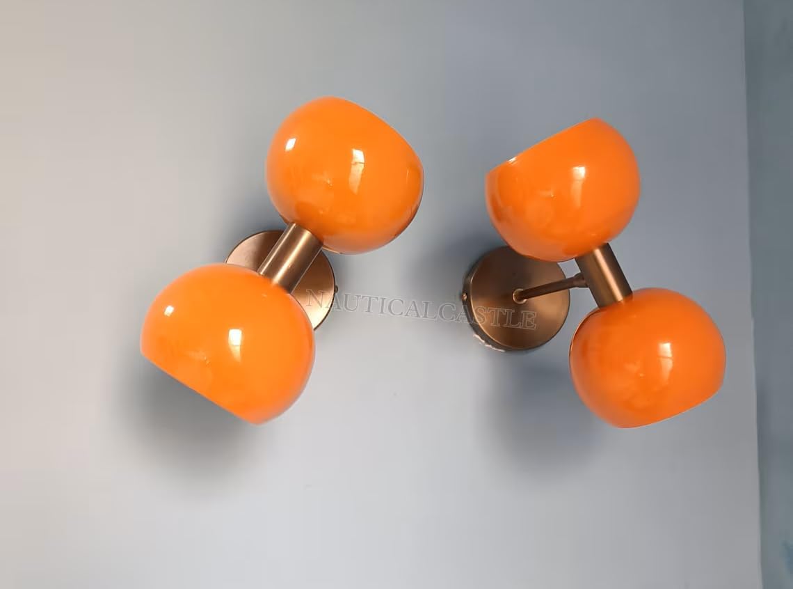 Illuminate your living space with these stunning mid-century modern wall sconce lights from Italy. Crafted in the 1950s, this pair of adjustable Diabolo sconce lamps exude vintage charm with their sleek, minimalist design and vibrant orange hue. Featuring a spherical glass shade mounted on a brass-toned arm, these wall-mounted fixtures provide a warm, ambient glow perfect for bedside reading or accentuating your decor. Easily adjust the angle to direct the light where you need it most. Bring a touch of retro sophistication to your home with these stylish and functional Italian wall sconces.