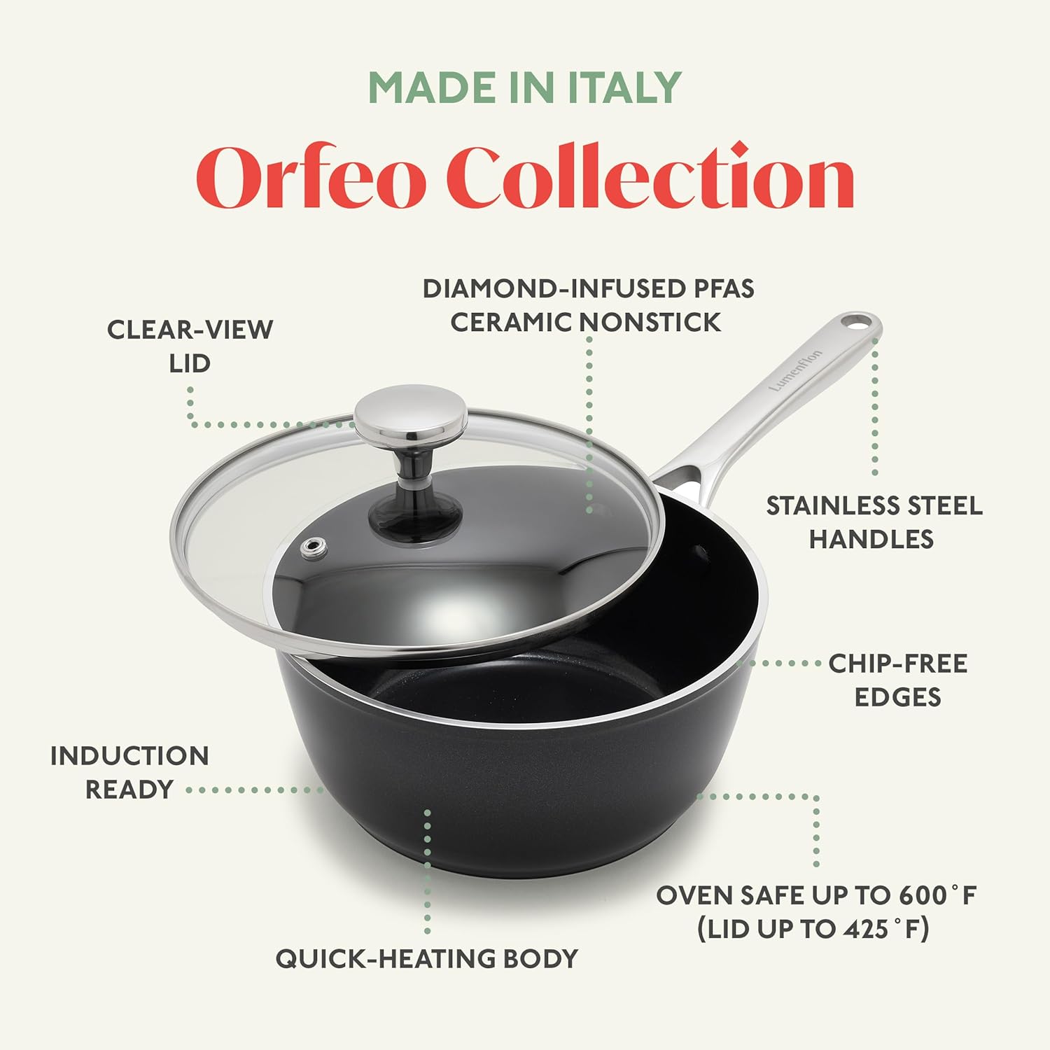 Crafted in Brescia, Italy—home to Lumenflon’s world-renowned cookware since 1972—the Orfeo collection blends Italian precision with cutting-edge innovation. Each frypan and sauté pan is engineered with ultra-tough Plasma Tech, a laser-infused treatment that reinforces the pan’s surface with aluminum and titanium particles for extreme durability and smooth release. The PFAS-free ceramic nonstick delivers professional-level results without toxins, while the quick-heating bodies reduce hot spots for faster, more even cooking. Induction ready and oven safe up to 600˚F (lids up to 425˚F), Orfeo is built to handle serious heat. Finished with chip-resistant rims and stainless steel handles, every detail is crafted for lasting strength and effortless control. Complete with clear glass lids for easy monitoring, Orfeo turns everyday meals into elevated moments.