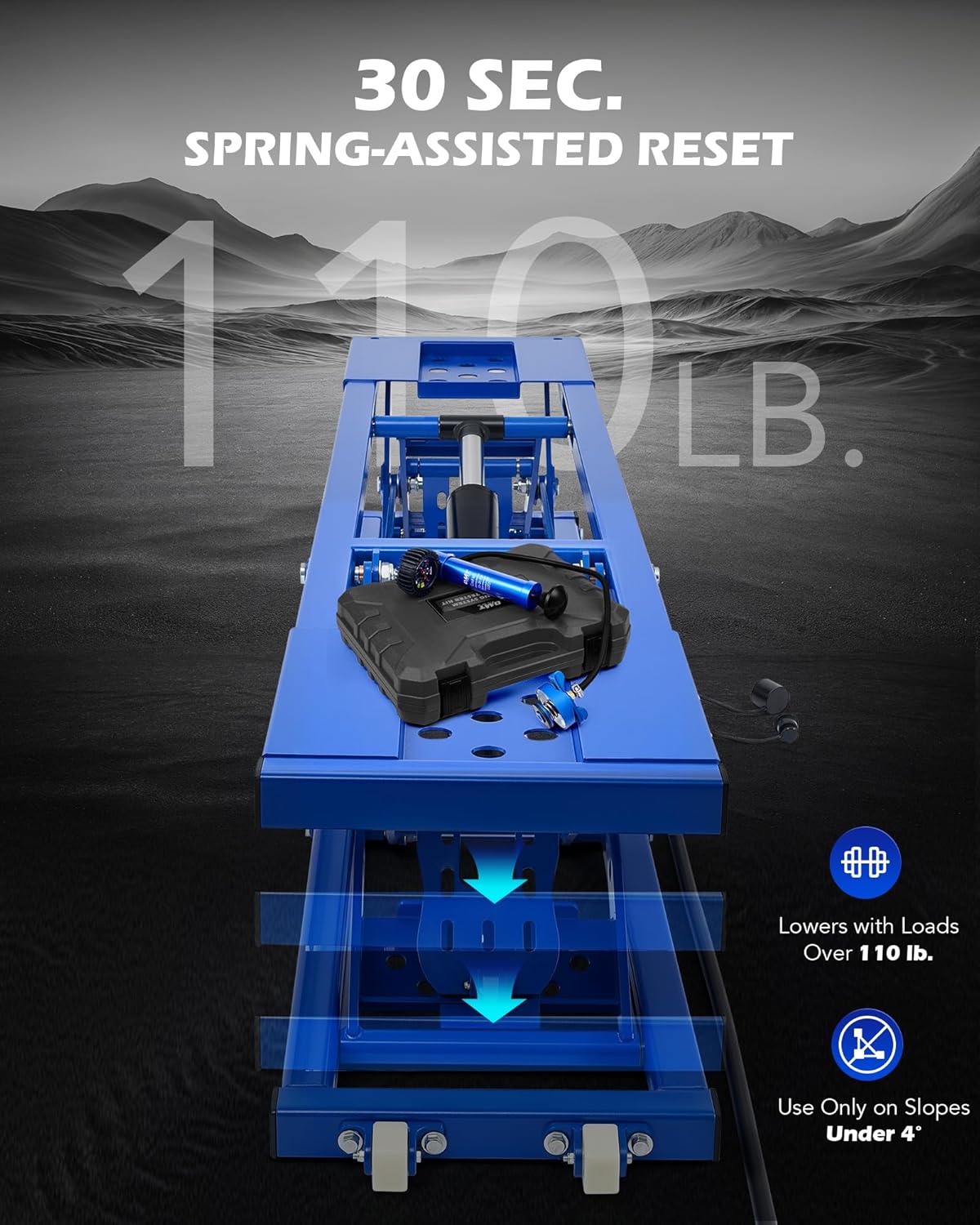 | Included Components | 1x Portable Car Lift 2x Extension Plates, 4x Lifting Columns 4x Rubber Blocks 2x Hoses, 4x Wheels 2x Handles 1x Hardware Set 1x Instructions |