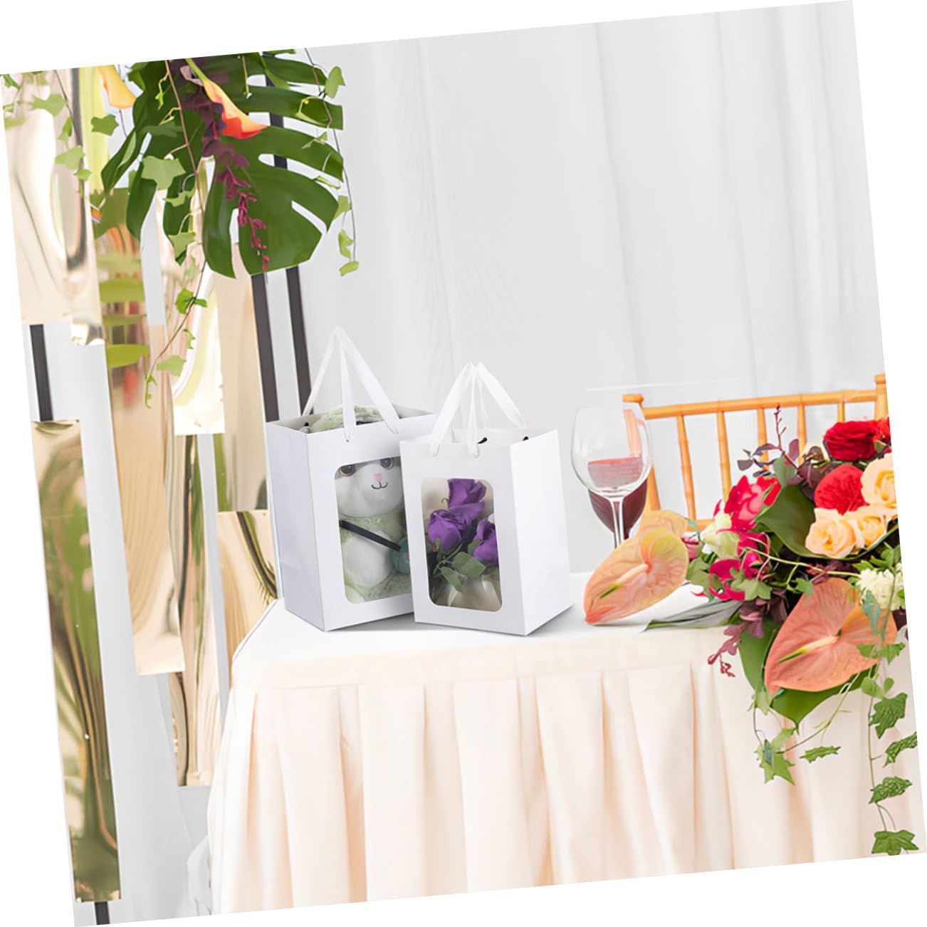 Package Include 25 x present bags Characteristics -Size:25.00X18.00X13.00cm/9.82X7.07X5.11in kraft paper bags -Material:Paper Wedding Bags -Color:White Bag with Clear Window -The small size of the bags makes them easy to carry and for giving as party favors or souvenirs Clear Bags. -The bags are also great for packaging small items like jewelry or cosmetics size. -This unique design adds of elegance and sophistication to any -giving occasion Wrapping Bags For Presents. -Designed with a windowed feature that allows to see the beautiful presents party favor bags. -Whether it's a Christmas party or a wedding, these bags will enhance the overall presentation and make your stand out drawstring bags.Goods InformationTreat Bags Enhances the presentation of any occasion.Party Favors Bags as party favors or souvenirs.Shopping Bags with Handles They are reusable and versatile for various packing needs, suitable for various events, providing a versatile option for any occasion.Wrapping Bags For Presents Made with materials.Paper Bags The Windowed Transparent Bags for Holiday Parties are elegant and sophisticated with transparent window