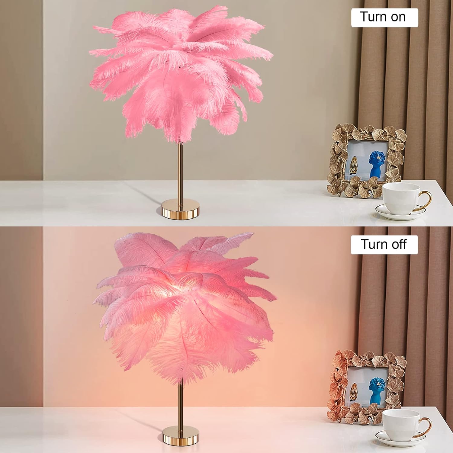 Material: Metal, Feather Color Option: Pink Finish: Gold Dimmable: Yes Color Temperature Type: Warm White Diameter of Base: 4.7"/120mm Overall Height: 19.7"/500mm 5 pieces Bulb for each lamp: 3W LED lamp(included, not eligible for free replacement) The copper wire fixes all the feathers together, and you can adjust the angle of each feather to shape the shape of the lampshade.