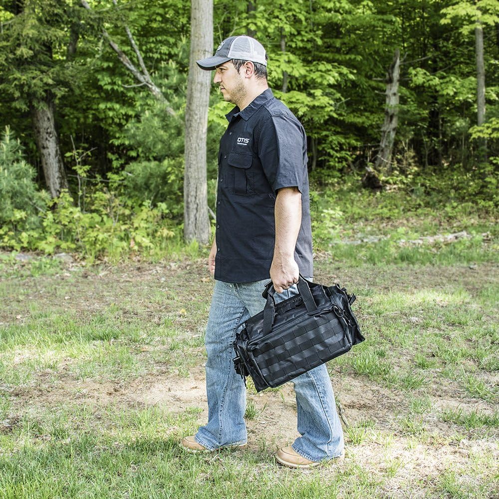 Everything you need to head to the range for a fun-filled day of target shooting. Fill your new 20oz Otis tumbler to keep your coffee hot or water cold, pack your favorite guns, mags and ammo and you're ready to go. This range bag includes eye protection and ear shield 31DB NRR ear protection. We've even supplied the peel and stick targets! when the Bulls eyes are shot out, and you're out of ammo, it's time for a quick clean. Pull out the included 11"x17" gun cleaning mat and give your firearms a little tlc with a Ripcord - 3 included for quick and effective cleaning of .223cal/5.56mm rifles, .30 Cal rifles and .38cal/9mm pistols. For additional clean, use the included AP brush 3 pack (2 white nylon, 1 stiff Blue nylon), microfiber gun cloth 3 pack, and O85 CLP wipes 2 pack. Before leaving the range, tear open a lead remover wipe (3 included) to remove Toxic metals from your hands and keep you and your loved ones safe. This range bag itself is full of features to complement your needs. Transport handguns, magazines, ammunition and other shooting gear to the range. The large interior compartment includes removable dividers to keep contents organized. Six exterior pockets, two of which are padded and one features pistol magazine pouches. Additional gear can be attached quickly to the exterior of the bag with the MOLLE webbing. Transport easily and comfortably with the carry handles or shoulder strap.